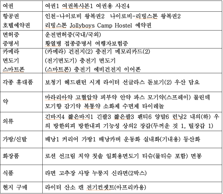 70 고개를 넘은 우리 나이에 장거리 해외여행을 하려면 제일 먼저 건강이 뒷받침해 주어야 한다. 특히 각종 풍토병이 우려되고, 킬리만자로 트레킹을 일정에 포함시키는 아프리카 여행은 더욱 건강과 체력이 중요하다. 그리고 언제 발생할지 모를 질병을 고려해 챙겨가야 할 약도 많게 된다. 평소 복용하는 약 뿐만 아니라 설사와 복통 약은 물론 감기약도 준비해 가야하며 안약, 피부약, 수면제, 피곤할 때 먹을 타이레놀도 필요하다. 자외선 차단제도 필수품이지만 나는 가져는 갔으나 사용은 하지 않았다.