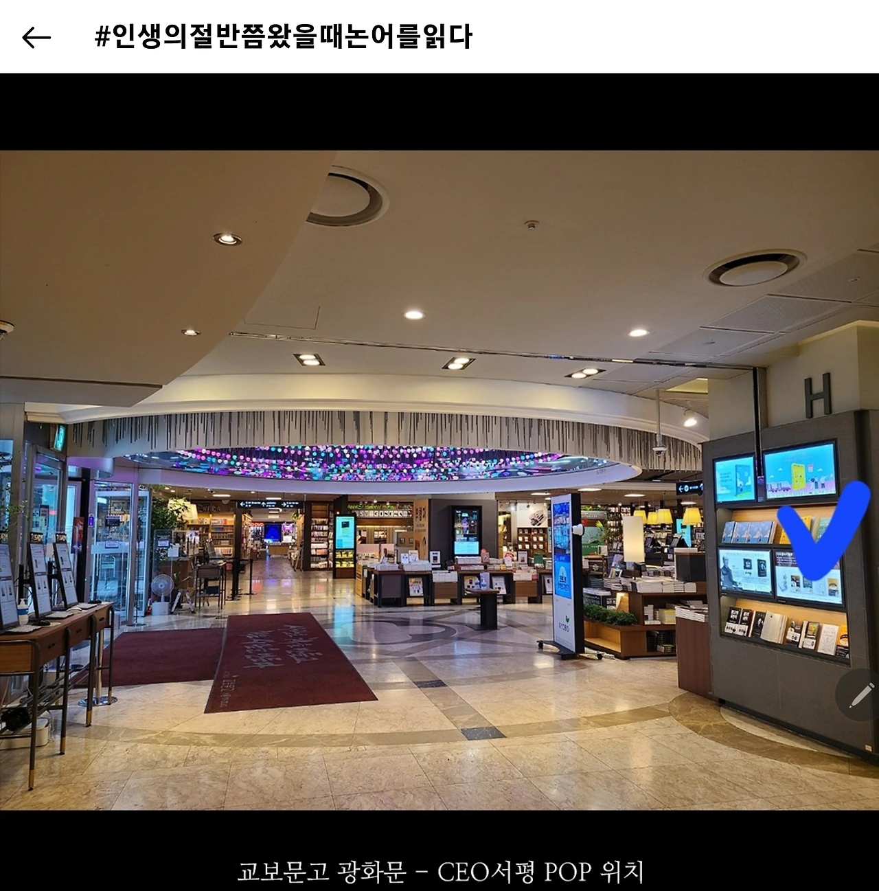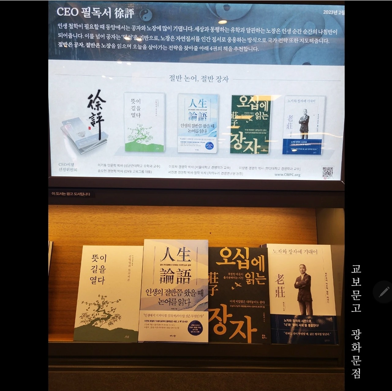 뒤늦게 발견했지만, KBS <라디어 시사고전> 진행자 이신, 서진영 원장님의 인스타그램 포스팅 덕분에 ‘인생의 절반쯤 왔을 때 논어를 읽다’가 올해 2월 교보문고에서 서원장님 추천으로 CEO 필독서로 선정된 것을 알게 되었습니다.