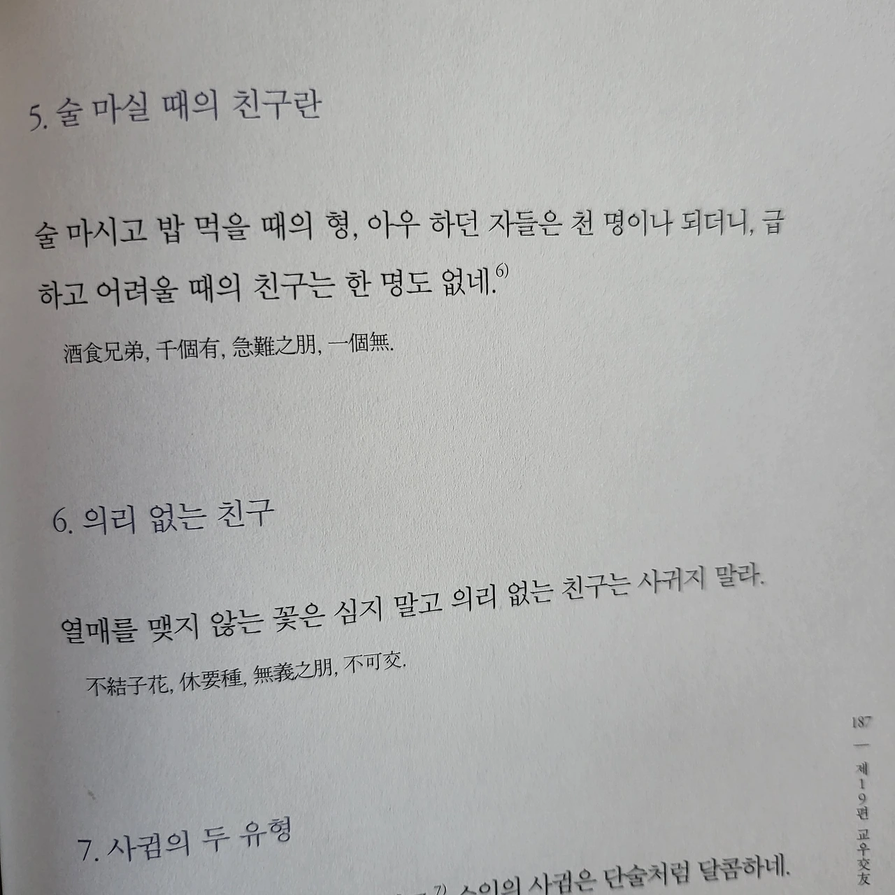 “술 마시고 밥 먹을 때의 형, 아우 하던 자들은 천 명이나 되더니, 급하고 어려울 때의 친구는 한 명도 없네” - ‘채근담’ 중에서