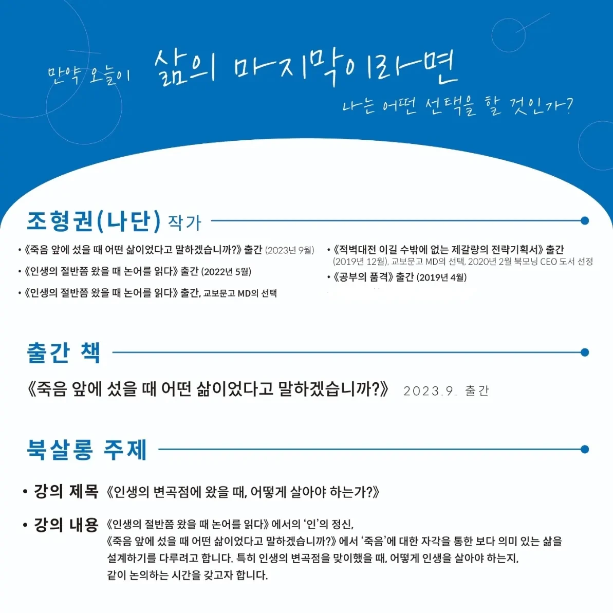 《오십에 읽는 맹자》,《죽음 앞에 섰을 때 어떤 삶이었다고 말하겠습니까?》, 《인생의 절반쯤 왔을 때 논어를 읽다》, 《적벽대전, 이길 수밖에 없는 제갈량의 전략기획서》저자입니다.