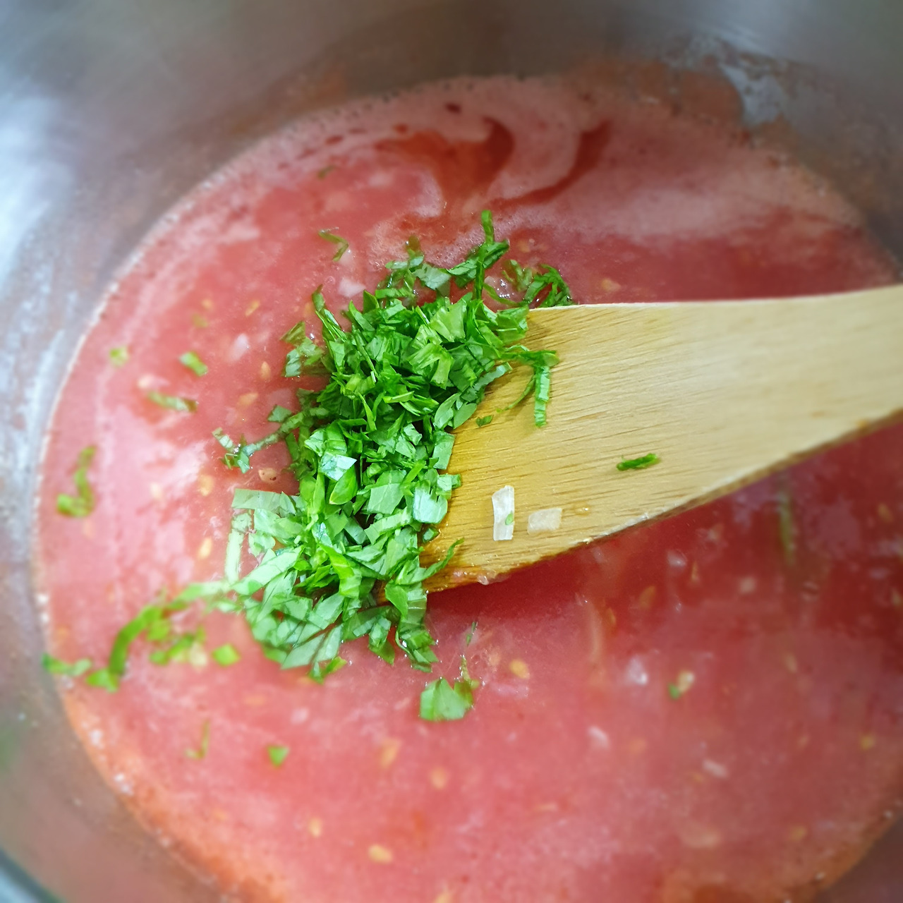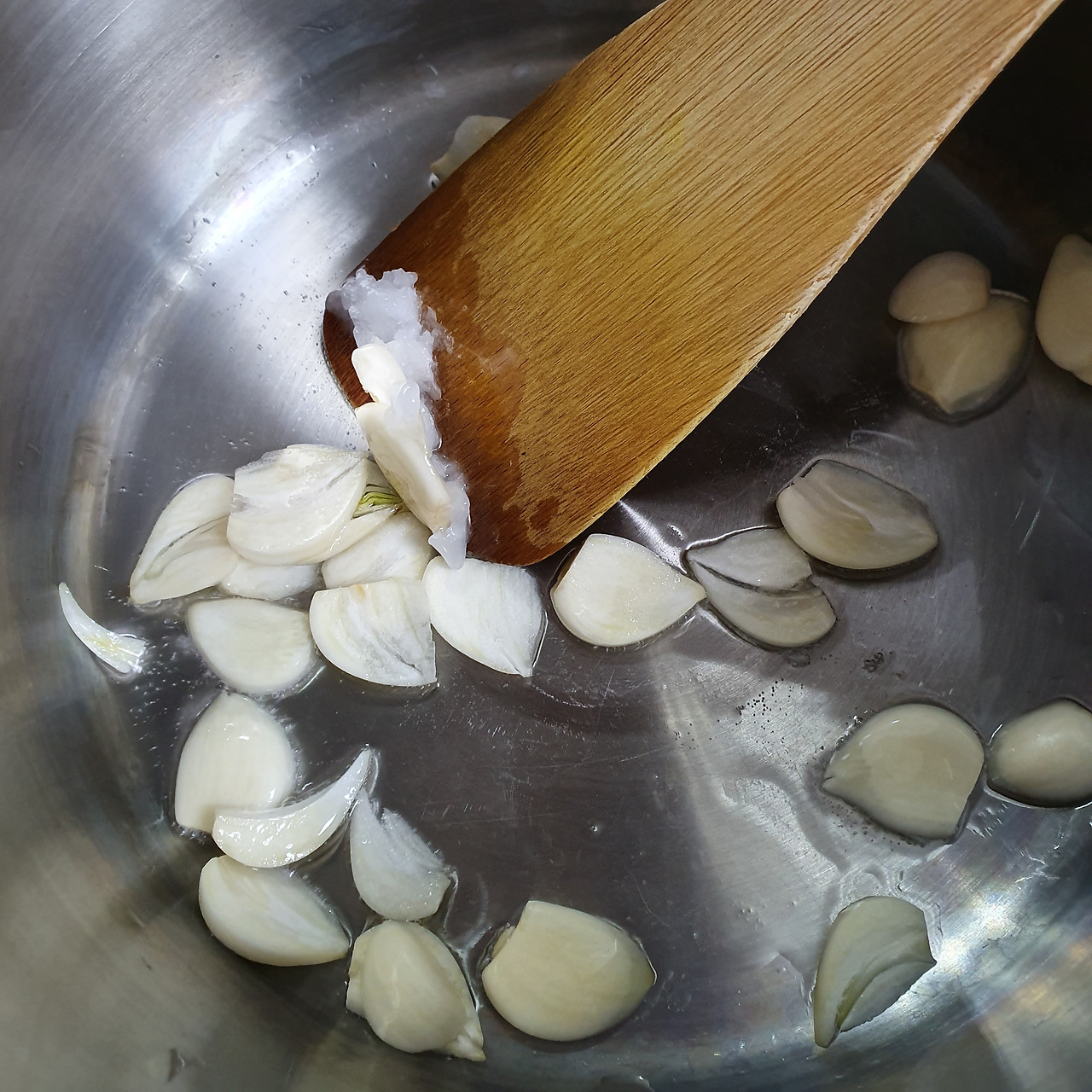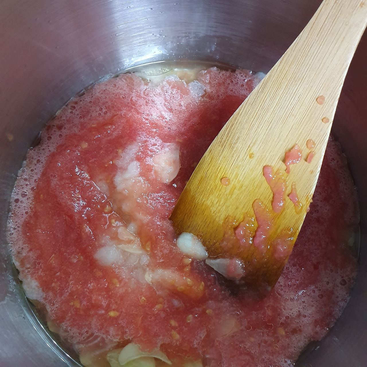 먼저 코코넛 오일을 두른 냄비에 편 썬 마늘을 볶는다. 고소한 코코넛 오일 향과 마늘 익는 냄새가 퍼지며 식욕을 자극하기 시작한다. 마늘이 노릇해지면 강판에 토마토와 양파를 갈아 넣어 익힌다.