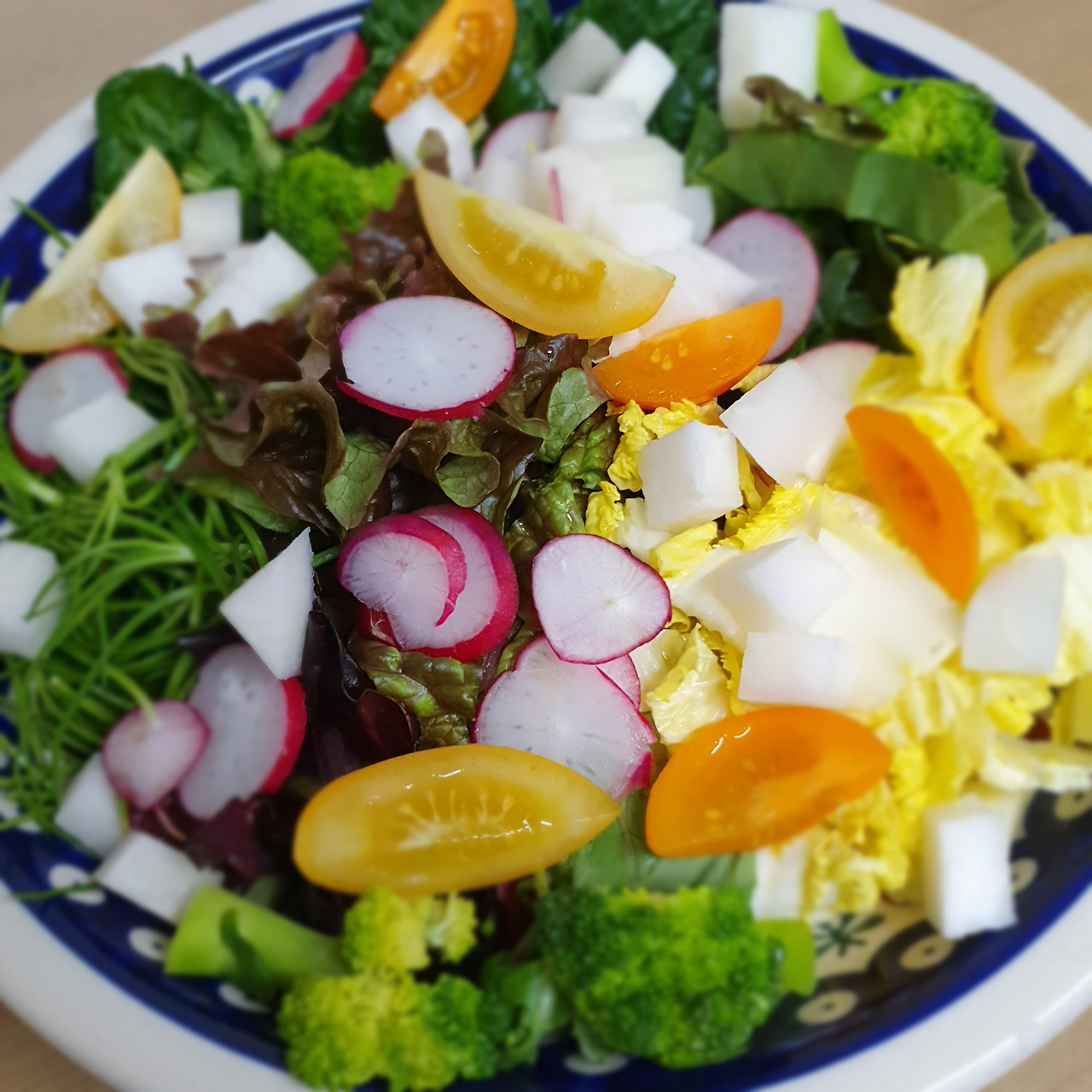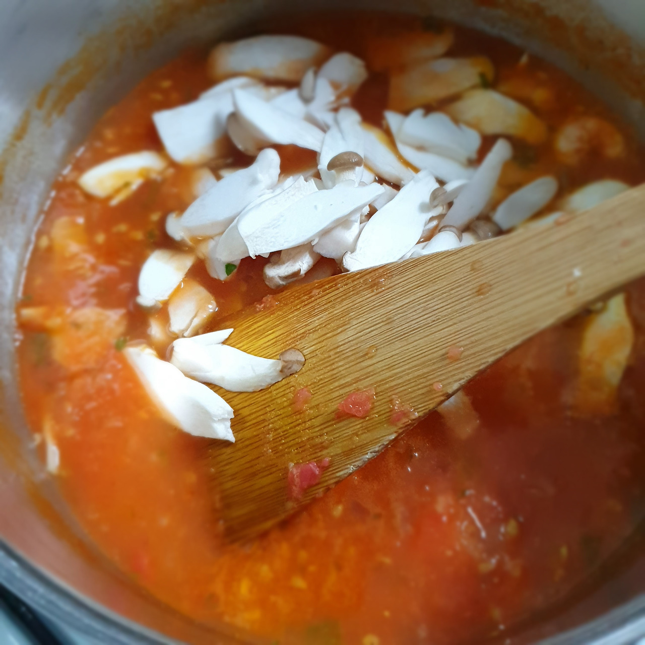 거기에 향긋한 샐러리도 잘게 다져 넣고 새송이버섯도 썰어 넣는다. 또 우리 집에 항상 있는 당근 펄프도 듬뿍 넣었다. 재료들이 어우러져 화학 첨가물없는 순하고 부드러운 파스타 소스가 완성되었다. 소스를 약불에 두고 파스타에 곁들일 채소 샐러드를 준비한다.