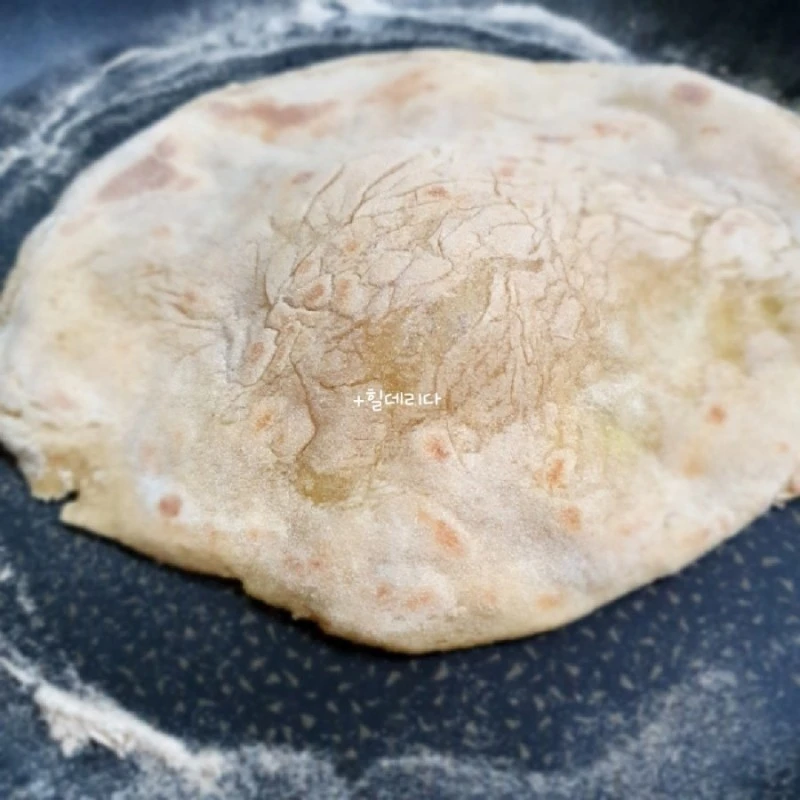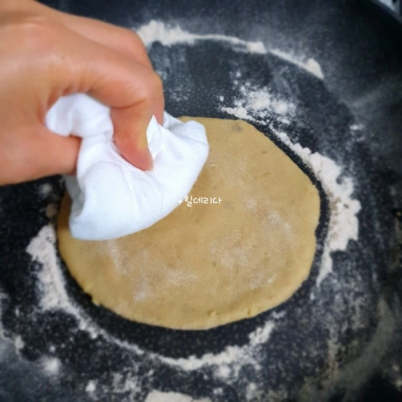 2. 달궈진 프라이팬에 반죽과 통밀가루를 묻혀 깨끗한 면포로 반죽을 꾹꾹 눌러 늘리면서 구워준다.