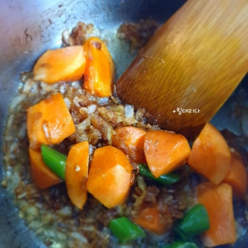 2. 캐러멜 라이징 한 양파에 딱딱한 식감의 재료(당근과 감자)를 먼저 넣고 슬쩍 볶아 물을 붓고 끓인다.