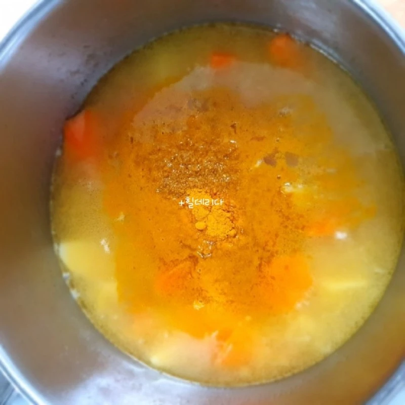 감자와 당근이 완전히 익으면 강황가루와 비건 카레가루를 넣어 잘 풀어주고 미리 물에 개어 놓은 현미가루
