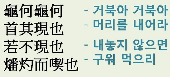 "거북아 거북아 머리를 내어라 내어놓지 않으면 구워서 먹으리"