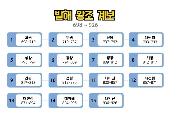 발해 전체흐름을 보자면 대조영(건국) → 대무예(팽창) → 대흠무(제도 완성) → 대인수 (최전성기) → 내부분열과 거란 압박으로 쇠퇴하다 멸망했다.