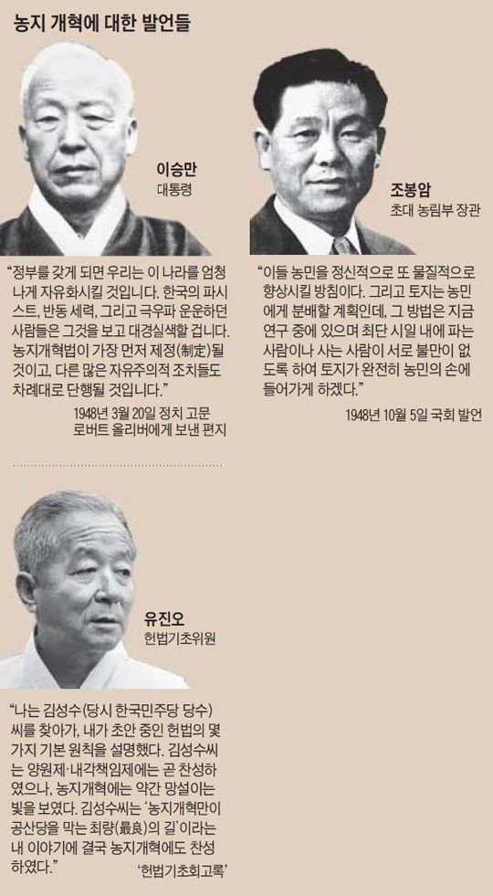 물론 이때 '농지개혁'은 이승만 개인 단독결단만으로 이루어진 것은 아니다. 미군정 시기부터 개혁논의는 이어졌고, 좌우이념 대립 속에서 농민층 요구도 강했다. 남북의 냉전구도 또한 개혁을 촉진한 배경이었다.