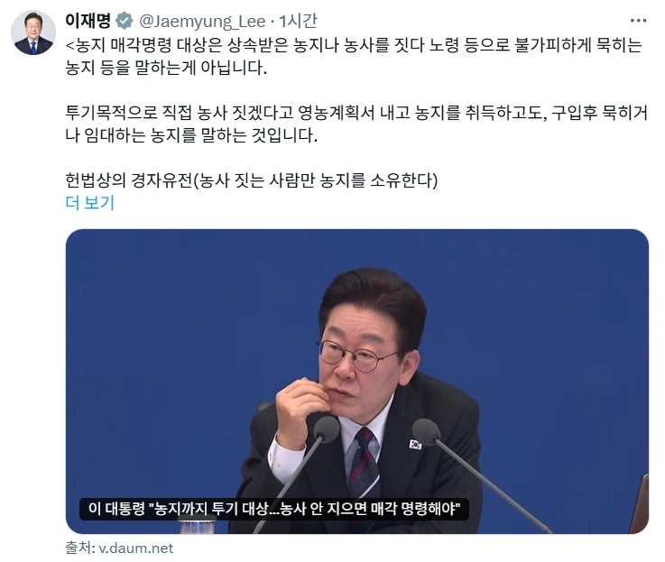 이재명 대통령(이하 이재명)이 25일 ‘농지 매각 명령’ 지시를 향한 비판에 대해