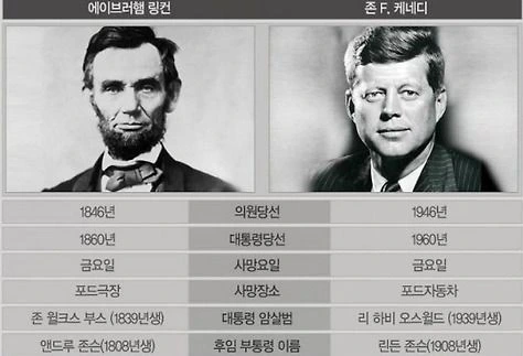 가장 널리 알려진 사례로는 '에이브러햄 링컨'과 '존 F. 케네디' 암살사건이 있다. 약 100년 시차 두고 반복된 역사적 비극은 많은 이들에게 "역사는 반복된다"는 인상을 남겼다. (아래 사진 참고)