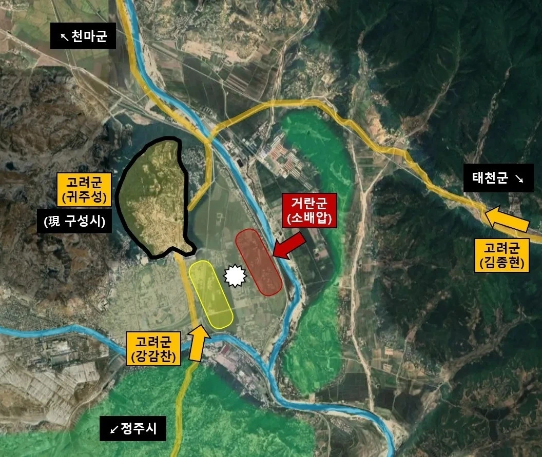 뒷 걱정을 안 하려고 배수진을 치고 고려와 치열한 접전을 벌이고 있던 거란군에게 후미에서 생각지도 못 한 고려기병 1만 명이 갑자기 등장하니 거란군은 당황해 혼비백산을 한다.