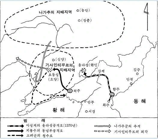 1370년,10월 공민왕은 요동성에 남아 있던 기사인테무르를 잡아 족치기 위해서 원정군 총 책임자 도통사시중 '이인임'을 필두로 야전군총사령관인 서북면도원수 '지용수', 서북면부원수 '양바얀', 동북면원수 '이성계', 안주상만호 '임견미'를 임명하여 그 군대를 요동성으로 향하게 했다.