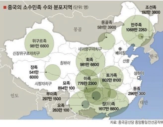 중국은 대표적인 다민족 국가다. 공식적으로 56개 소수민족이 있으며, 그중 인구 100만이 넘는 소수민족만 17개다. 조선족은 약 192만 명으로 10위권에 속한다. 중국 인구의 92%가 한족이고 소수민족은 8%에 불과하지만, 소수민족이 차지한 자치구 면적은 전체영토 64%에 이른다. 주요 지하자원도 대부분 이 지역에 있다.