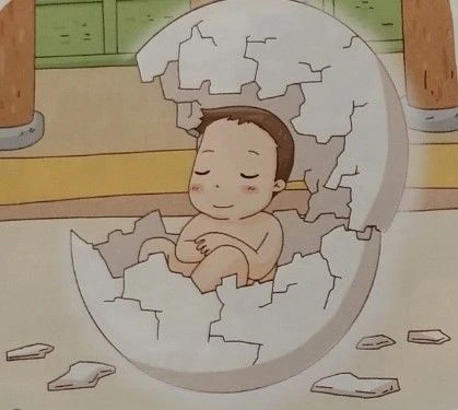 부여 왕은 그 알을 깨뜨리려 하였으나 깨지지 않자 결국 어미에게 돌려주었다. 어미는 다른 물건으로 알을 싸서 따뜻한 곳에 두었고, 마침내 한 사내아이가 껍질을 깨고 나왔다.”