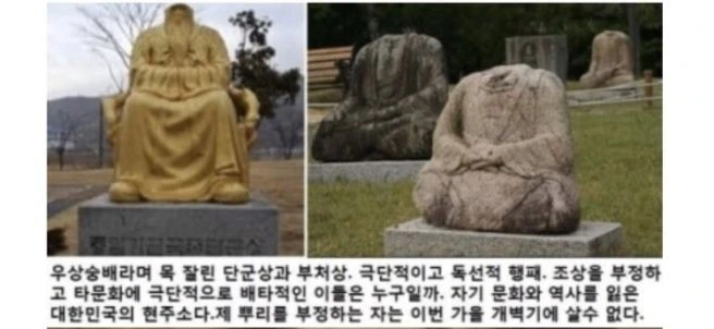 지금은 아니지만 한 때 단군 동상 머리가 잘렸고, 우상이라며 망치질 당했다.