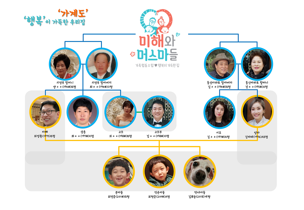 문득 재미난 발상이 떠올랐다. 어쩌다 뉴스를 보면 대기업 재벌가의 지배구조와 승계구도를 가계도로 설명했던 기억. 역사 속 조선왕조의 519년간 27명의 왕조계보와 가계도의 기억이 훅 하고 지나갔다. 가족을 설명하지 말고 보여주는 방법은 없을까. 그 순간 무릎을 탁 치며 떠오른 생각 하나. 그렇지 우리 집에도 가계도를 만들어 보는 거다. 일단 복잡하지 않고 단출하게. 할아버지 할머니와 아이들까지 삼대를 그리고 이름과 생년, 나이, 혈액형으로 구성원의 개인 특성을 넣어 얼개를 맞췄다. 흰 종이 여백을 채우는 가족의 얼굴은 마치 살아있는 듯 서로가 서로에게 연결되어 하나를 이뤘다. 새로운 시대 변화와 삶 속에서도 변치 않아야 할 것은 가족의 이해다. 그래 가족을 설명하지 말고 보여주자.