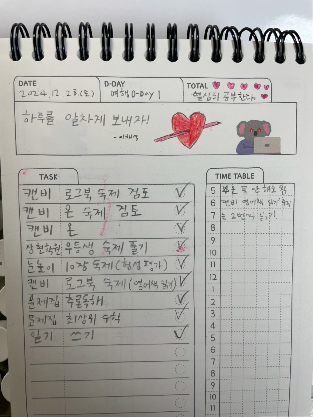그래서 초롱이에게도 이번 겨울방학에는 영어숙제, 수학 문제집 했다고 체크만 하는 것이 아니라 진짜 모르면 시간이 걸리더라도 알아가고 다시 읽고 쓰는 시간을 알려주고 싶다.