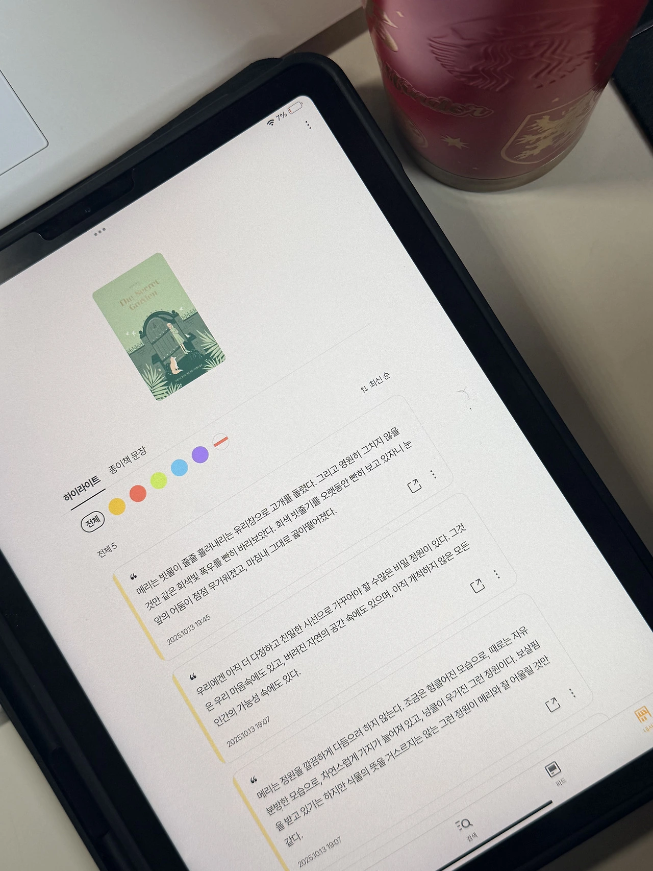 나의 비밀 정원은 어떻게 꾸며지고 있을까? 지금 새싹이 올라오고 있을까? 예쁜 꽃들이 피어있을지, 생각하게 만드는 글이었다. 또 나의 화원에 아이들과 함께 즐길 수 있다면 얼마나 좋을까. 그렇게 하기 위해선 지금 나의 욕심을 조금 덜어내고 아이들을 있는 그대로 이해하는 연습을 해야겠다고 생각했다.