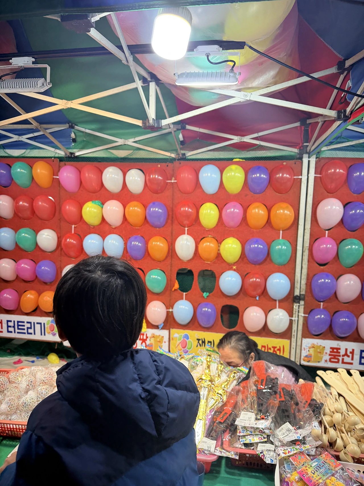 유원지나 놀이동산에 가면 늘 있는 풍선 터트리기는 누가 하냐면서 돈 아깝게 저런 것을 왜 하냐고 늘 그냥 지나쳐 온 우리였지만, 동네에 열리는 야시장에서는 분위기가 다르다.