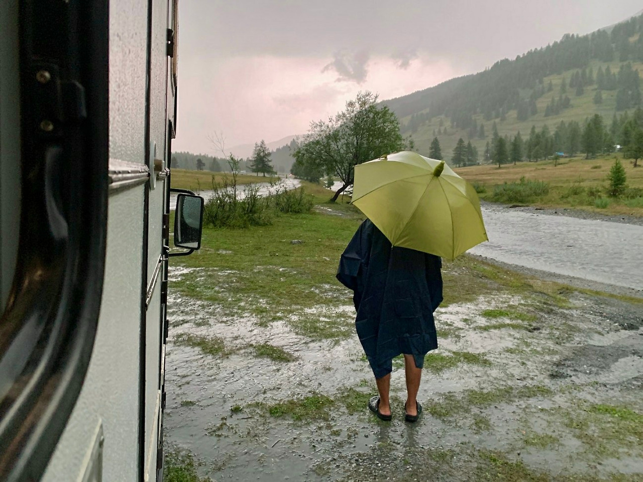 게다가 우리는 계곡 물이 내려오는 강 바로 옆에 주차하지 않았던가. 우리 차는 비포장도로와 강 사이 풀밭에 세워져 있었는데 한 시간 만에 비포장도로는 물길이 되었고, 얼음처럼 맑고 얕았던 강물은 흙탕물이 되어 마구 불어나기 시작했다. 덜컥 겁이 났다. 산에서 비가 올 때는 물가에 있으면 안 된다는 말이 머리에 맴돌았다. 그렇지만 도로로 올라가기도 여의치 않은 상황이어서 초초하게 상황을 지켜볼 수밖에 없었다.