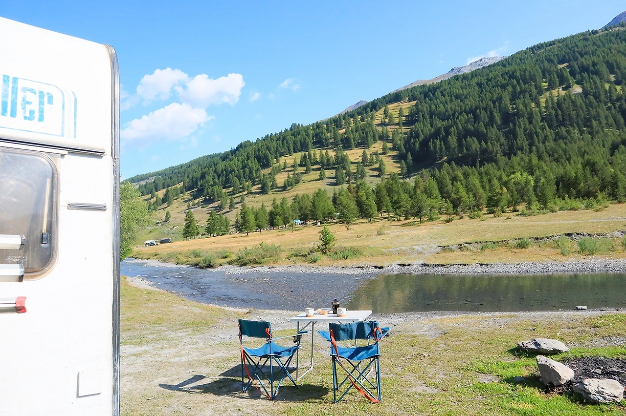 둘러보니 길과 얕은 강줄기 사이에 있는 꽤 넓은 공터가 두 곳 눈에 띄었다. 캠핑카로 길을 가리고 강이 보이게 테이블을 놓으면 딱 좋을 것 같았다. 한 곳에는 이미 캠핑카가 있어서 우리는 조금 떨어진 옆자리에 들어가기로 했다.