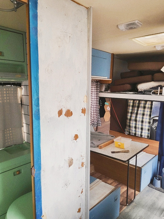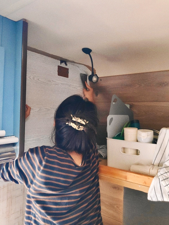 벽으로 쓸 나무판은 창고 문을 재활용했다. 원래 침대 바닥 겸으로 쓰이던 거라 너무 두껍고 무거워 지난 여행 내내 고생했었다. 뭐 하나 꺼내고 넣을 때마다 침대를 들어올려야 한다고 생각해 보라. 지난 여행 내내 이 문짝을 떼어내고 싶었었는데, 드디어 떼내어 재활용까지 하니 후련했다.