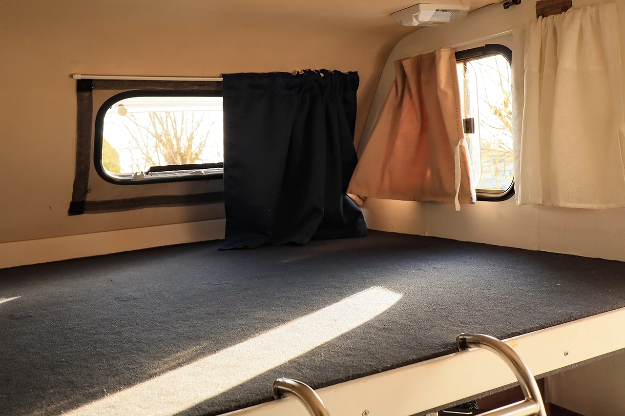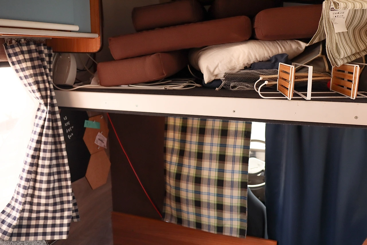 침실 창문의 방충망은 틈 사이로 모기가 다 들어왔던 걸 개선하기 위해서 지퍼가 달린 방충망을 구해서 완전히 벽에 붙여 버렸다. 그 바람에 기존의 탈부착식 창문가리개를 쓸 수 없게 되어 일반 커튼 형식으로 암막커튼도 새로 만들어 달아야 했다. 암막커튼은 중국 사람이 하는 가게에서 할인하는 걸 사 와서 잘라서 쓰고 남은 것은 운전석 뒤에도 달아 알뜰하게 다 썼다.