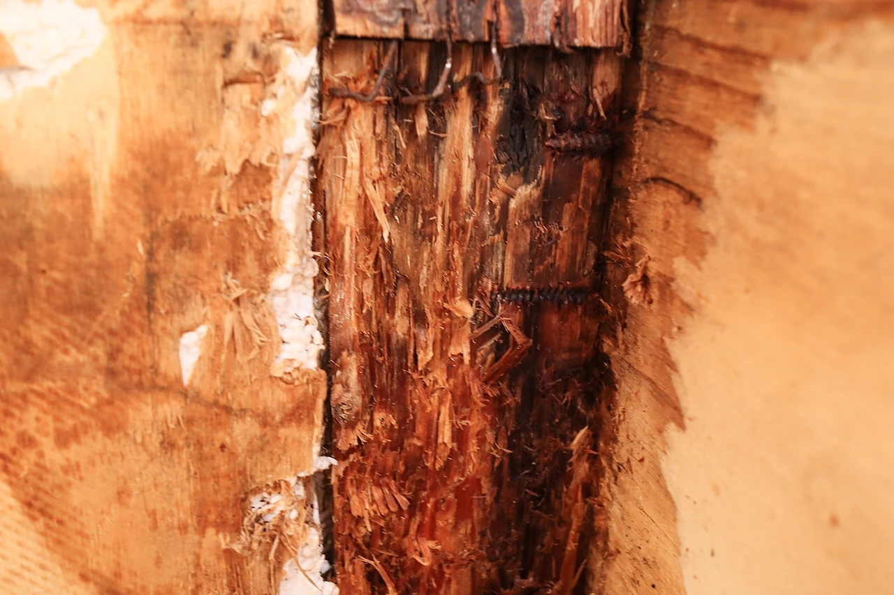 창문과 창틀을 다 떼어내고 벽을 파냈다. 다 파냈는데 왼쪽 벽과 이어지는 부분이 축축한 느낌이라 그쪽도 뜯어 보니 역시나 벽 일부와 모서리 기둥이 다 젖어 있었다. 아직 썩진 않았지만 완전히 젖어 있는 이런 기둥은 단단하고 질겨 파내기가 더 힘들다. 손이 부르트고 물집이 잡혔지만 며칠 동안 매달려 다 파냈다. 그러고 나니 외벽이 낡아 생긴 구멍들이 보였다. 실리콘으로 구멍을 막고 벽을 다시 해 넣었다.