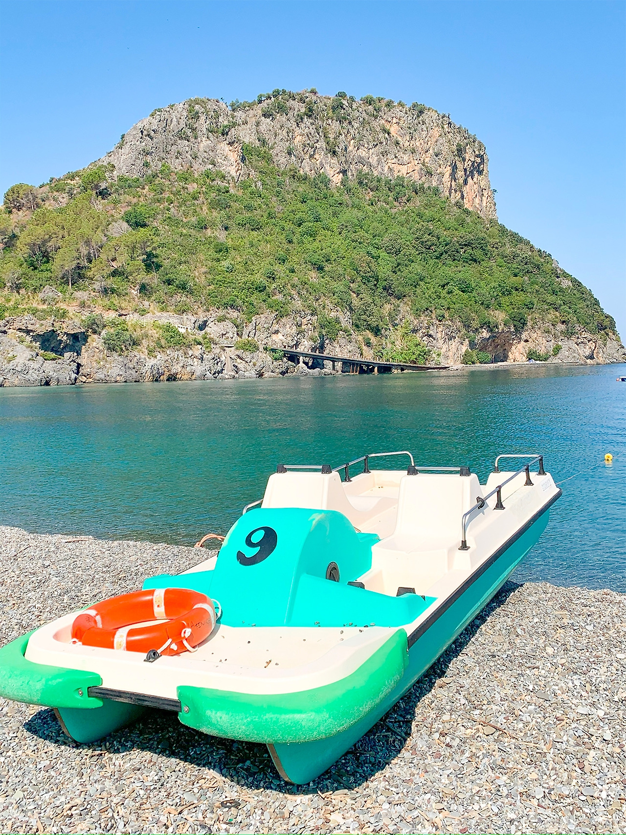 진심이냐고 확인하는 남편에게 힘주어 고개를 끄덕여 보이며 차에 다시 올랐다. 그냥 가겠다고 하니 직원은 그러라는 말도 없이 등을 홱 돌려 가 버렸다. 여기까지 와서 고작 10유로에 꼭 가고 싶었던 해변을 포기하는 것이 속이 쓰렸지만.. 물가가 싼 칼라브리아에서 10유로면 디노 섬이 보이는 해변에서 페달로를 탈 수도 있고, 해변 바에서 차가운 맥주를 다섯 병이나 마실 수 있는 돈이다. 이런 인간들에게 그 돈을 쥐어 주느니 페달로를 타든 맥주를 잔뜩 마시든 하자며, 우리는 곧바로 주차장에서 나와 전날의 해변으로 갔다. 그곳에서 오리배처럼 페달을 굴려 타는 플라스틱 배인 페달로를 빌렸다. 한 시간에 10유로, 디노 섬이 워낙 해변 가까이에 있어서 한 시간이면 섬의 아름다운 동굴 두 곳을 둘러보기에 충분했다.