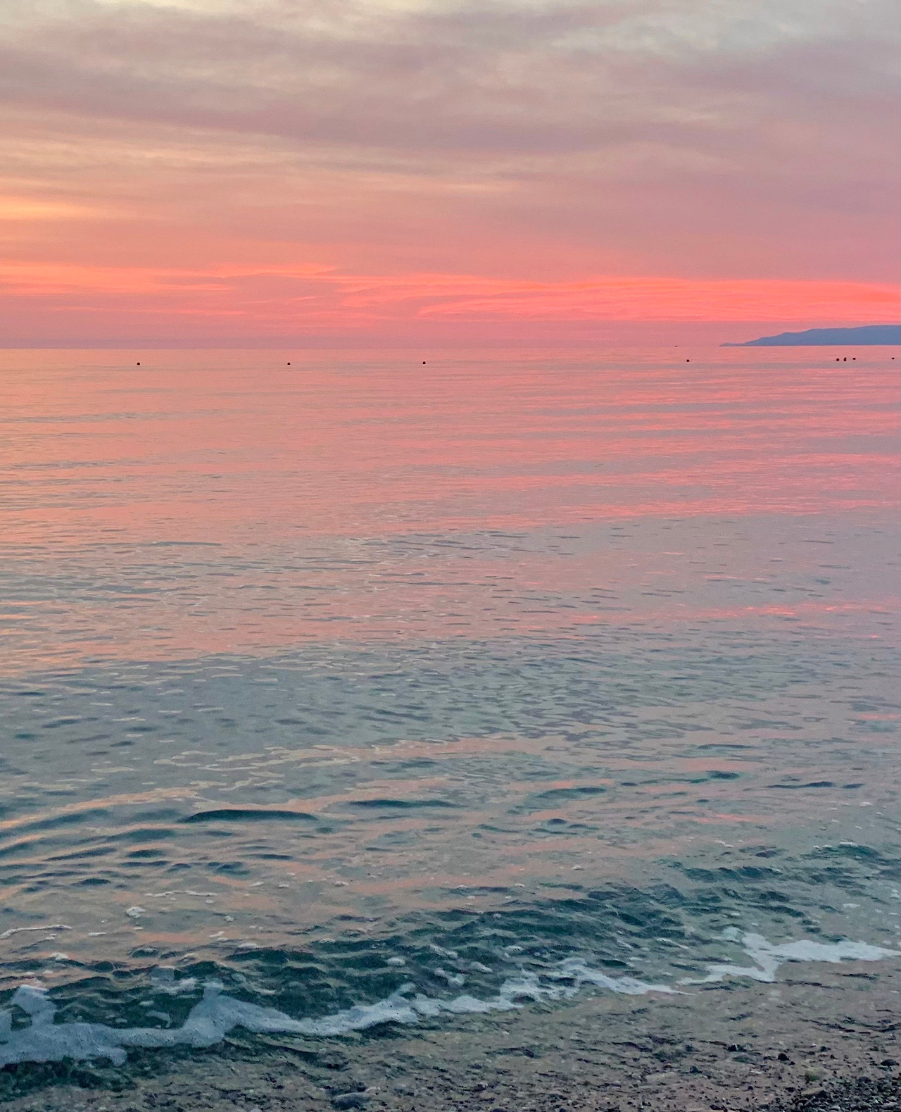 칼라브리아의 선물은 그게 끝이 아니어서 그날 저녁, 참치샐러드캔을 따서 저녁으로 먹고 쉬고 있는데 창밖으로 보이는 하늘 색깔이 오묘했다. 밖으로 고개를 내밀어 보니 서쪽 하늘에 분홍빛이 번지고 있었다. 심상치 않은 노을인 것 같아 우리는 바닷가로 뛰다시피 걸어갔다.