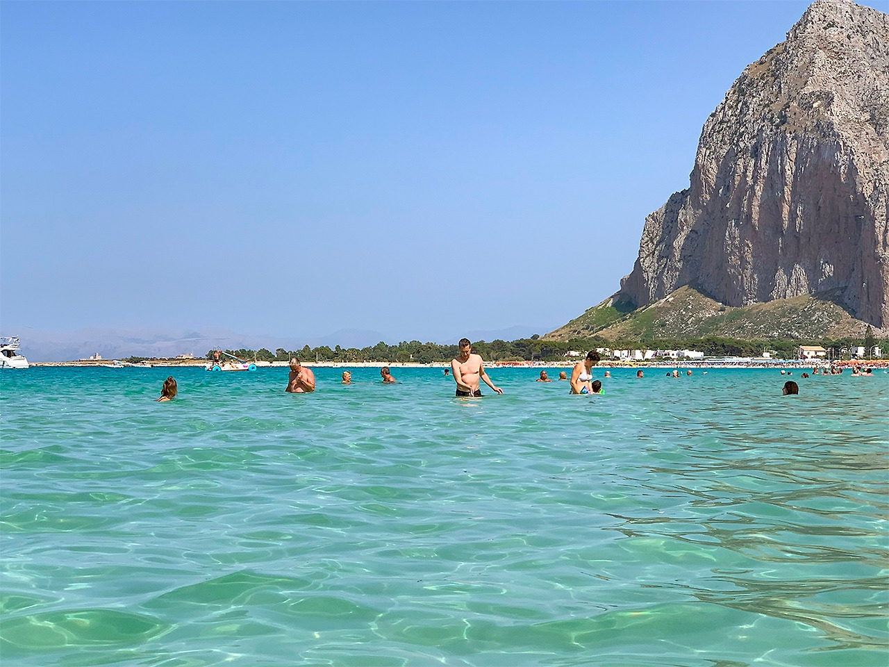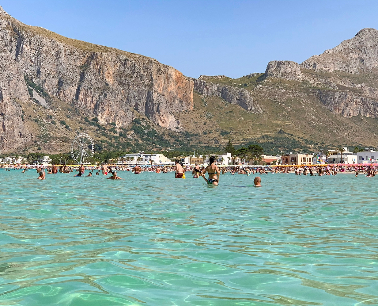 그늘 없이 뜨거운 햇볕이 내리쬐는 거리를 걸어 해변으로 갔다. 햇빛이 너무 강해 눈이 멀 것 같았지만 녹색에 가까운 에메랄드빛 바다와 해변 옆으로 놀라울 정도로 높이 솟아오른 바위산이 아름다워 선글라스를 쓰고 싶지 않았다. 눈을 최대한 가늘게 뜨고 눈앞의 풍경을 바라봤다. 인기가 많은 곳이라 그런지 아직 성수기가 아님에도 해변은 색색깔의 파라솔과 선베드로 빼곡했고, 수많은 사람들이 해변을 즐기고 있었다. 눈앞에 솟아오른 바위 산이 너무 거대해서 넓은 해변에 가득한 사람들이 모두 개미 같아 보였다. 우리는 해변 이쪽 저쪽을 둘러보다 파라솔과 선베드가 없는 해변 끝 무료 해변에 우리가 가져온 파라솔을 꽂고 비치 타월을 깔았다. 시칠리아에 와서 무려 300km를 넘게 달린 후에야 드디어 시칠리아다운 아름다운 해변에 자리를 깔고 누운 것이다. 드디어!!