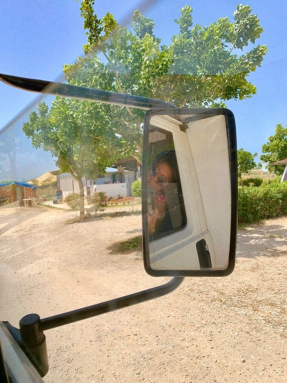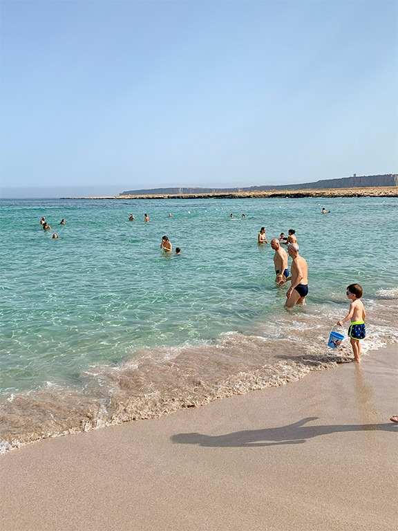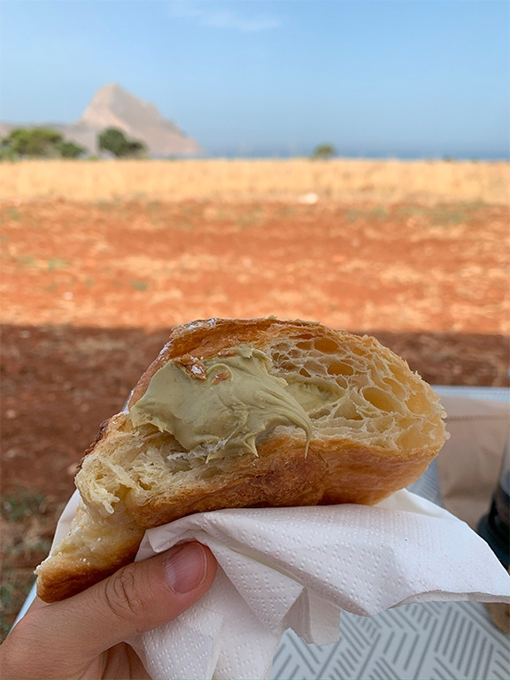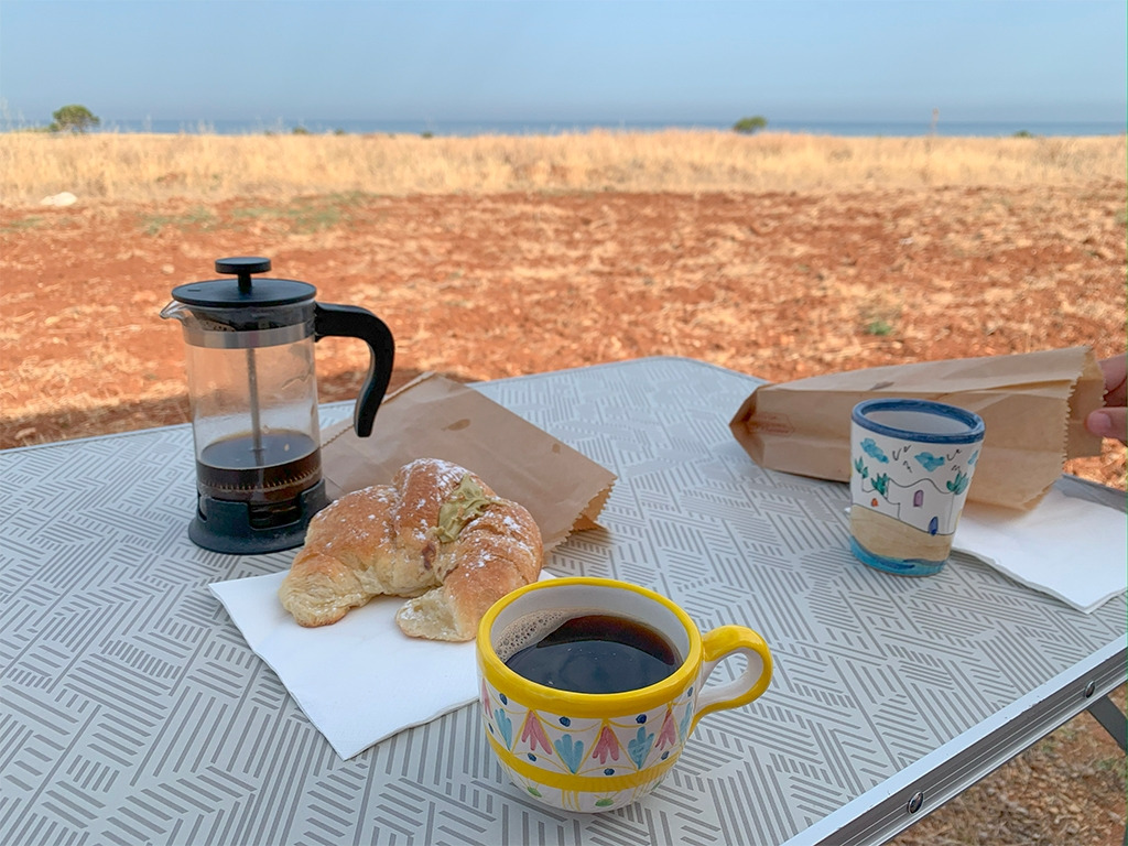그리고 해변과 주차장을 오가는 무료 셔틀 열차를 빼놓을 수 없다. 이 주차장에서 해변까지는 거리가 조금 있는데, 이 셔틀 열차 덕분에 뜨거운 햇살 아래 해변까지 다녀오는 수고를 훨씬 덜 수 있었다. 주차장도 무료로 이용하는데 셔틀 서비스까지, 우연히 발견한 곳이 이렇게 좋은 곳일 줄이야. 화장실과 샤워 문제만 해결된다면 여기서 남은 시간을 다 보낼 수도 있을 것 같았다. 아침마다 오는 빵차에서 피스타치오 크림이 가득 들어간 커다란 꼬르네또(Cornetto; 크루아상과 비슷한 이탈리아의 페이스트리)를 사 먹는 즐거움도 이곳의 매력이다.