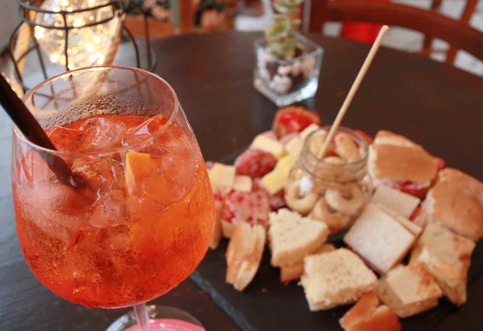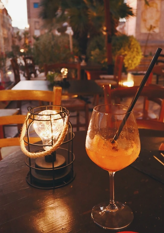 그리고 골목에서 나와 광장에 도착했을 때는 놀랄 수밖에 없었다. 넓고 뽀얀 광장에 독특한 양식의 건물들과 민트색 돔을 올린 거대한 대성당이 나타난 것이다. 저녁 시간이라 기울어가는 해의 진한 햇살이 광장 전체에 낭만적인 분위기를 더하고 있었다. 그리고 한켠에 바가 있었는데, 광장의 분위기에 반해 버린 우리는 돈도 아낄 겸 저녁 식사를 포기하고 거기서 아페리티보를 하기로 결정했다. 자리에 앉아 아페리티보 메뉴를 주문하고 아페롤스프리츠를 골랐다. 아페리티보(Aperitivo)는 초저녁 시간에 술을 주문하면 작은 샌드위치나 빵 조각 위에 이것저것 올린 브루스게따처럼 간단히 먹을 수 있는 음식을 같이 주는 이탈리아의 식전주 문화다. 함께 나온 음식은 특별할 것 없었지만 아페롤스프리츠가 제대로였다. 개인적인 취향이지만 여름에는 시원하고 달콤쌉싸름한 아페롤스프리츠만한 술이 없는 것 같다.