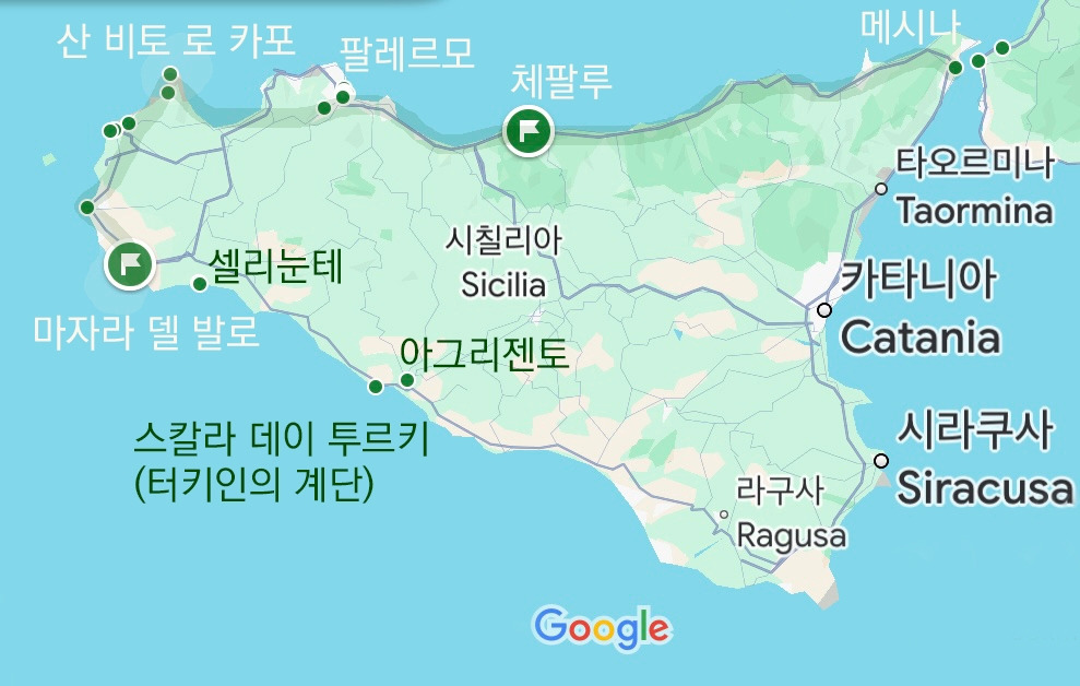 이쯤 해서 지도를 보자. 우리가 덧없이 이동만 한 경로가 확연하다. 우리는 서쪽 끝까지 거의 갔다가 이제 예정보다 빨리 남쪽으로 한참 내려와 있었다. 이대로 남쪽 해안을 따라 천천히 돌면 가장 좋겠지만, 이번 여름에는 가족처럼 아끼는 친한 동생 커플의 결혼식이 이탈리아에서 열릴 예정이라 7월 12일에 돌아가야 했다. 남쪽으로 돌 시간적 여유가 없었다. 돌아갈 때는 팔레르모에서 배를 타야 했기 때문에 우리는 멀리 가지 않고 최대한 서쪽에서 시간을 보내기로 했다. 오토캠핑장의 주인 할아버지께 어디가 좋을지 여쭤 봤더니 사람들이 잘 모르지만 가 볼 만한 곳이 한 곳 있다고 하셨다. 셀리눈테(Selinunte)였다.