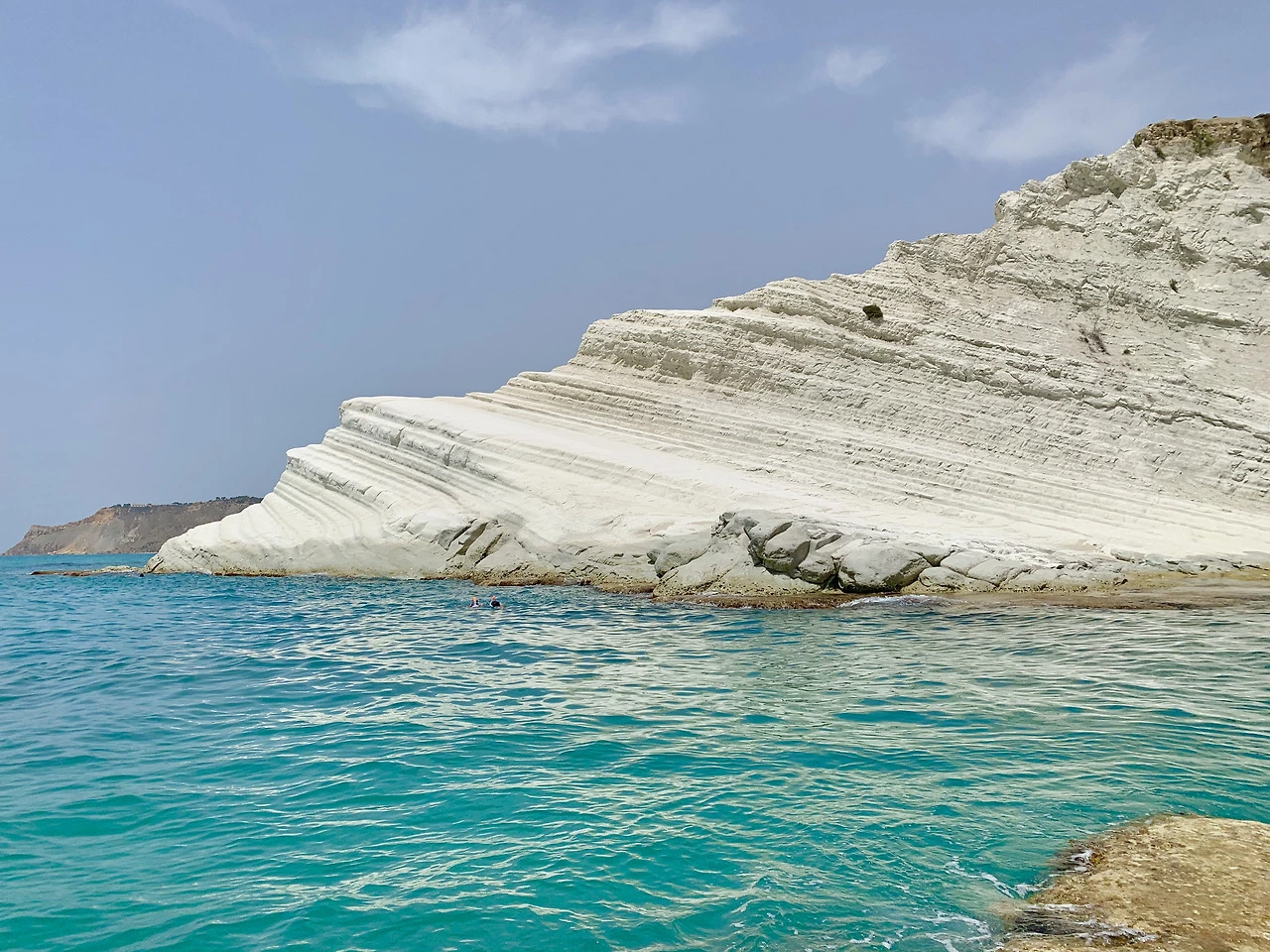 스칼라 데이 투르키(Scala dei Turchi)는 '터키인의 계단'이라는 의미다. 계단처럼 보이는 하얀 절벽. 이탈리아에서 '데이 투르키(dei Turchi)'라는 이름이 붙은 해변은 예전에 튀르크족이 침입해 온 곳을 의미한다. 그런데 그런 이름이 붙은 곳은 보통 해변이 아름답다는 사실. 그런데 이쪽 지형이 해변으로 가려면 계단을 엄청나게 내려가야 했다. 그리고 계단을 내려간 후에 바위가 듬성듬성 드러나 있는 해변을 한참 걸어야 했고, 그렇게 터키인의 계단까지 갔더니 출입 금지. 허허. 안전상의 이유로 올라가지 못한단다. 아쉬운 대로 새하얀 절벽이 보이는 그 부근에서 놀기로 했다. 그런데 그 앞 해변은 완전히 온갖 징그러운 해초 천지의 얕은 해변이어서 그걸 다 헤치고 밟고 200m 정도 가야 바위 위에 올라갈 수 있었다. 뭐든 실제로 보면 인스타에서 보는 것과 다른 법.