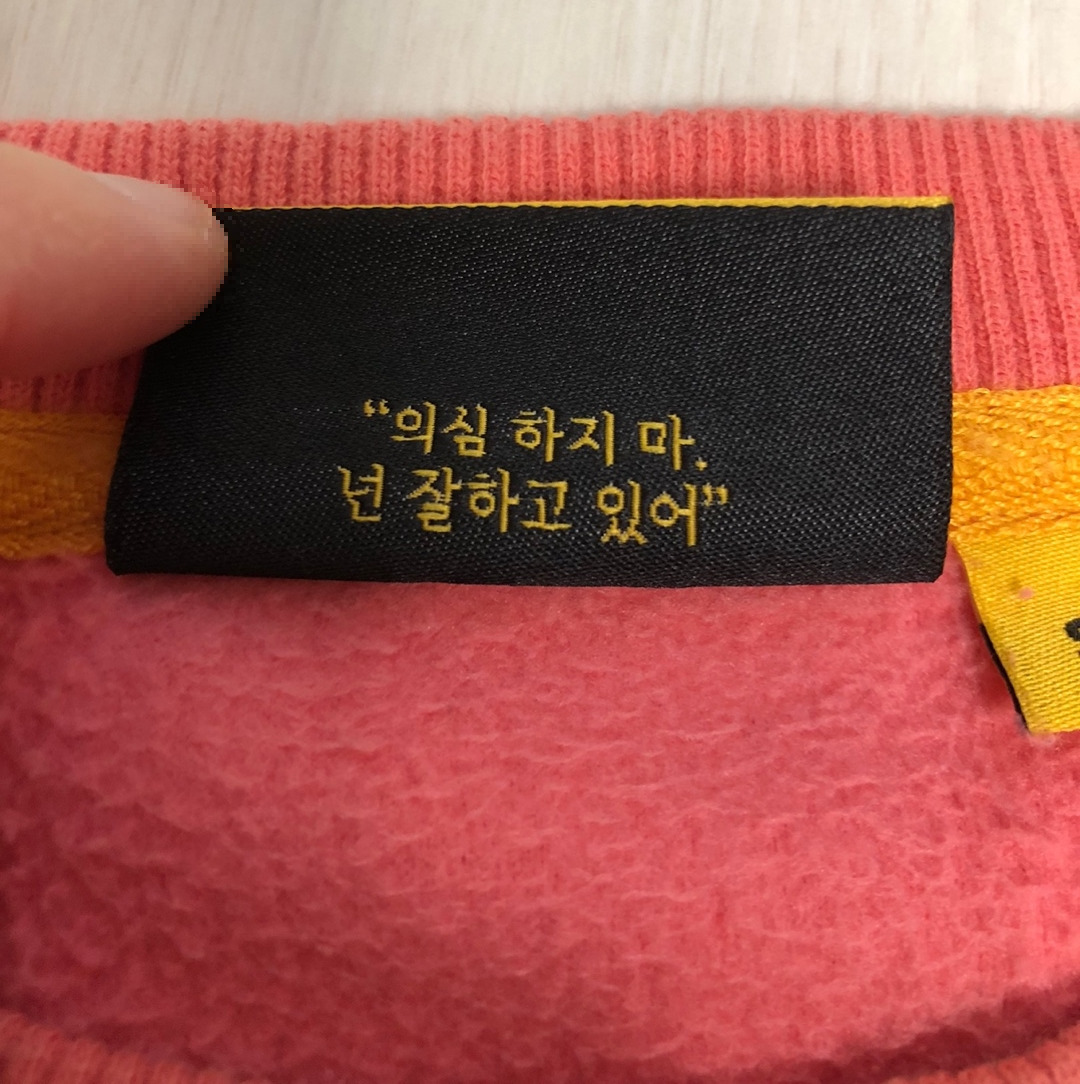 '이 옷을 만든 사람은 보이지도 않는 뒷면에까지 저렇게 세심하게 응원의 메시지를 넣어주셨구나' 싶어 마음이 따뜻해졌다. 누군가는 이 글을 만나 위로를 얻었으면 하는 바람으로 비용을 감수하고 수고롭게 저 작업을 했을걸 생각하니 그 위로가 더 진하게 다가왔다.