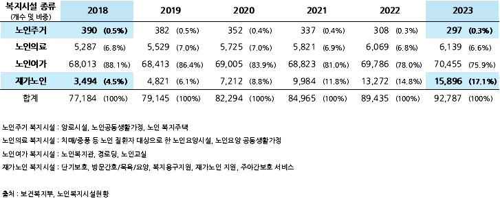 국내 노인 복지시설은 그 형태 변화 추세가 특이하다. 노인들이 직접 들어가는 생활하는 주거 형태의 복지시설은 점차 줄고, 노인들의 살고 있는 집에 방문하는 형태인 재가노인 복지시설의 비중이 급증하는 추세다. 즉, 상주 형태의 돌봄 서비스에 대한 수요가 크게 증가하고 있는 것으로, 돌봄 로봇은 효과적인 대안으로 부상하고 있다.