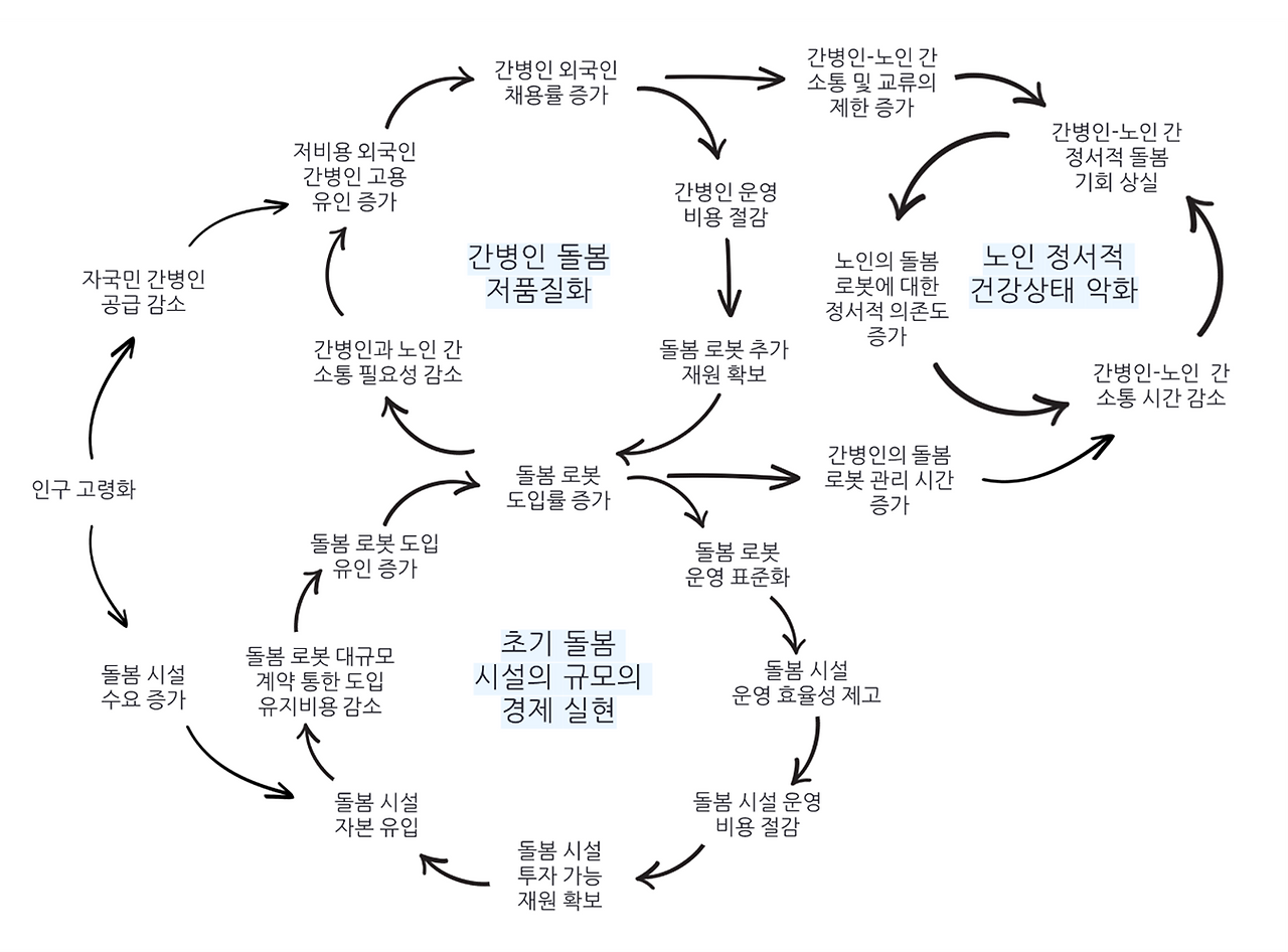 하나는 ‘(A) 저비용의 외국인 간병인 유입’ 이고, 다른 하나는 ‘(B) 돌봄 로봇 도입’ 이다. 이 두 방안은 톱니가 맞물린 기어처럼 서로를 가속화하며 돌봄 환경을 악화시킬 것이다.