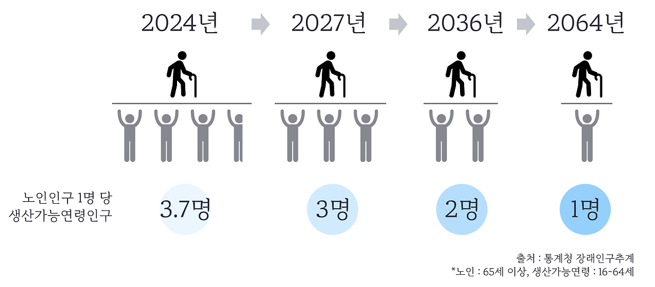 돌볼 사람이 부족하기 때문이다. 고령화와 저출산으로 인한 「부양비 증가」 가 핵심이다. 2024년 현재 노인 1명을 약 4명이 부양하지만, 2027년엔 3명, 2036년에는 2명으로 줄고, 2064년에 이르러서는 생산가능연령인구 1명 당 1명의 노인을 부양해야 한다.