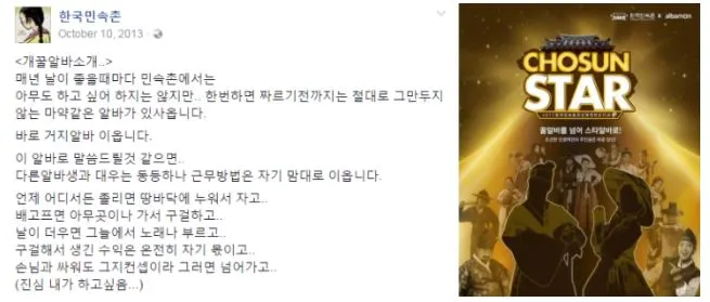 마지막으로 참고한 곳은 한국 민속촌이었다. 민속촌은 '속촌 아씨'라는 캐릭터가 조선시대 소녀랄까 낭자말투로 민속촌 소식을 소개하고 있었는데 게다가 ‘민속촌 알바’로 불리는 걸출한 캐릭터들이 활약해서 콘텐츠들을 만들고 있었다. 민속촌 알바란 민속촌 거지, 구미호, 사또, 체대생 등 민속촌 내 주민이면서 한 콘텐츠를 담당하는 역할이었는데 각각 끼있고 능력있는 친구들이 알바로 지원해서 열연을하니 지금의 콘셉질, 부캐놀이를 앞서간 느낌도 있다. 또한 당시로서는 드물게 영상매체를 활용하고 있었다. 아씨라는 캐릭터, 한명한명이 연예인 같이 활약하는 민속촌 알바, 스튜디오 같은 민속촌에서 당시로서 드문 야외촬영 영상까지(영상도, 야외촬영도 귀했다). 내가 참고한 곳 중 가장 전문적이고 본격적인 곳이었다. 이건 도저히 내가 할 수 없었다.