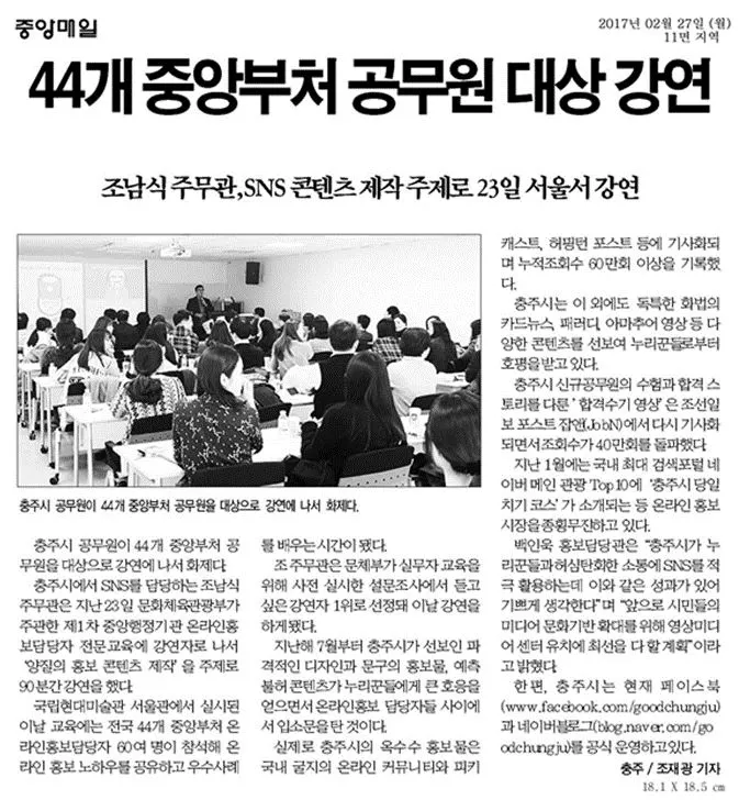 기뻤다. 충주시 홍보 사례가 드디어 이 바닥에 소문이 났구나, 전국에 퍼졌고 중앙에도 닿았구나 싶었다. 인디밴드로 활동하다가 갑자기 연말 가요대전 같은 행사에 초대된 기분이랄까? 그동안 내가 자리에서 하던 홍보가 시늉만 하는 홍보가 아니었구나! 음지에서 몇몇들끼리만 웃고 떠드는 매니악한 게 아니구나! 충주시 홍보가 전국의 불특정 다수에게 제법 넓게 퍼졌구나!가슴이 벅차올랐다. 무엇보다 인구 20만인 지방 작은 도시에서, 그것도 경력이 5년도 안된 어린 직원이 중앙부처를 모두 모은 자리에서 강연할 기회를 얻었다는 것은 대단한 사건이라 생각했다. 굉장한 서사를 갖는다 생각했다. 이 중앙부처 강연은 곧 '충주시 말단 공무원이 중앙부처 공무원 강의'같은 제목으로 보도자료가 나갔는데 나중에 생각지 못한 후폭풍을 불러왔다.