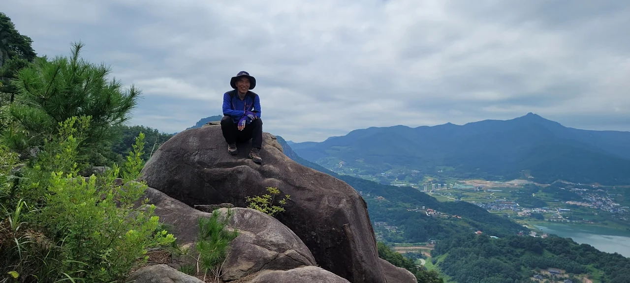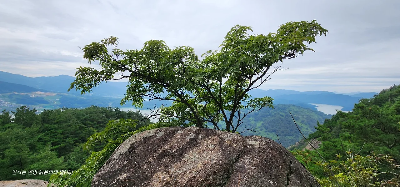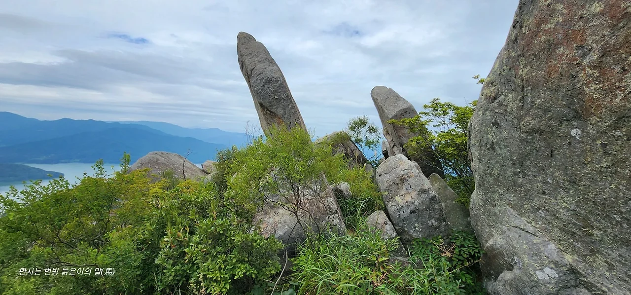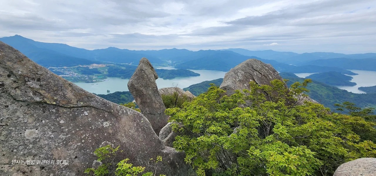 바위 여기저기를 옮겨 다니며 합천호수와 우뚝한 황매산을 배경으로 사진 놀이를 즐기다가 하산했더니 결국 구름 속에 구멍이 숭숭 뚫려서 오후 내내 굿은 비가 오락가락했습니다