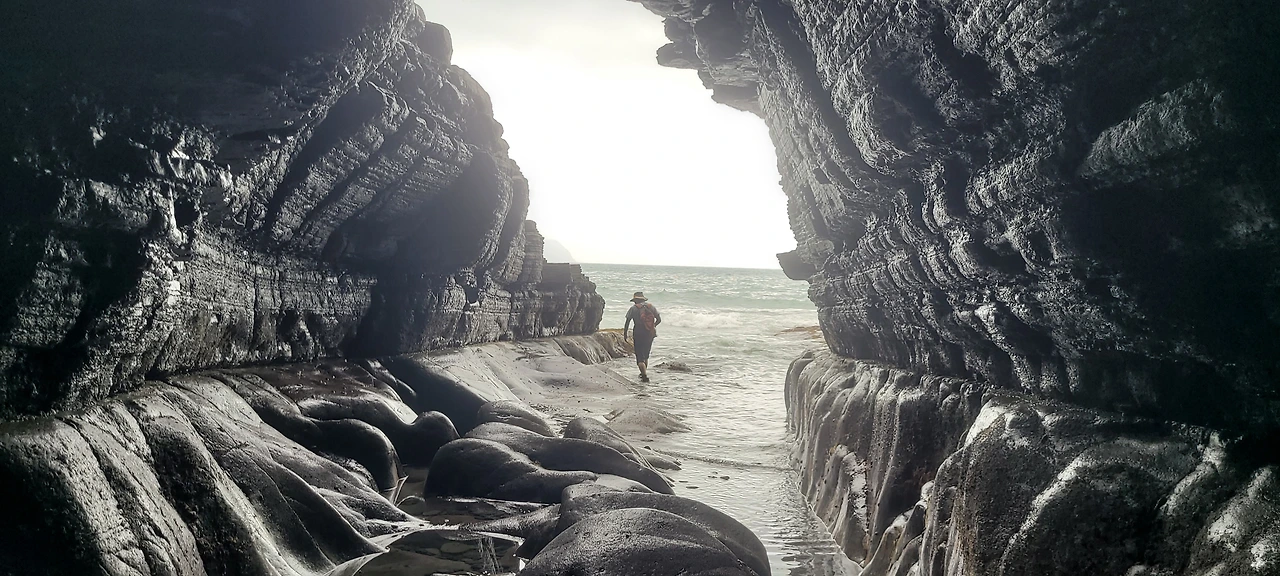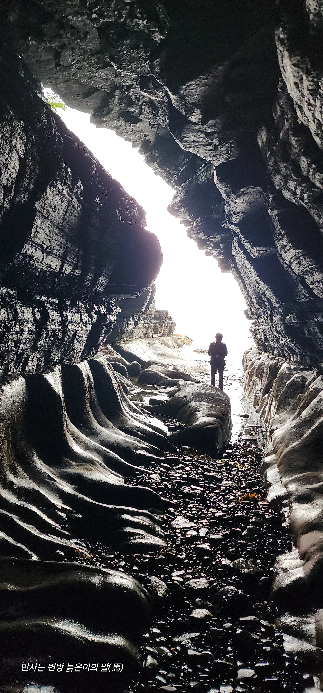 마침 시루바위에서 선답하고 있던 8명의 탐방객도 용굴 탐사에 나섰고 비슷한 시간에 해식해안을 통과하게 되었는데 아마도 이곳은 우리보다도 경험이 적은 듯하였습니다