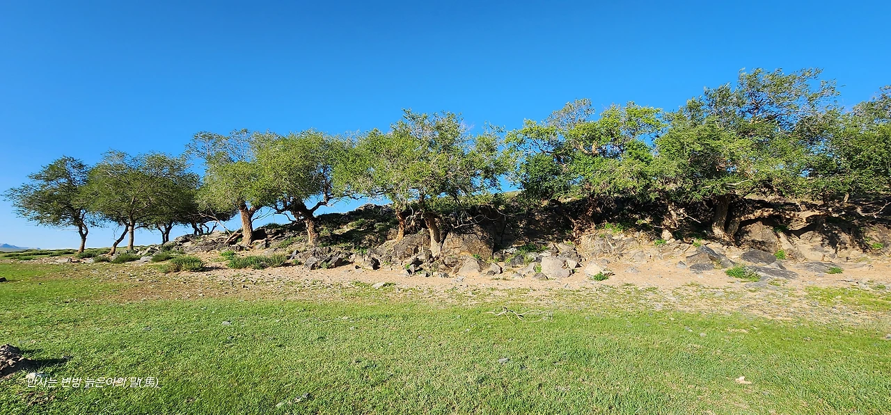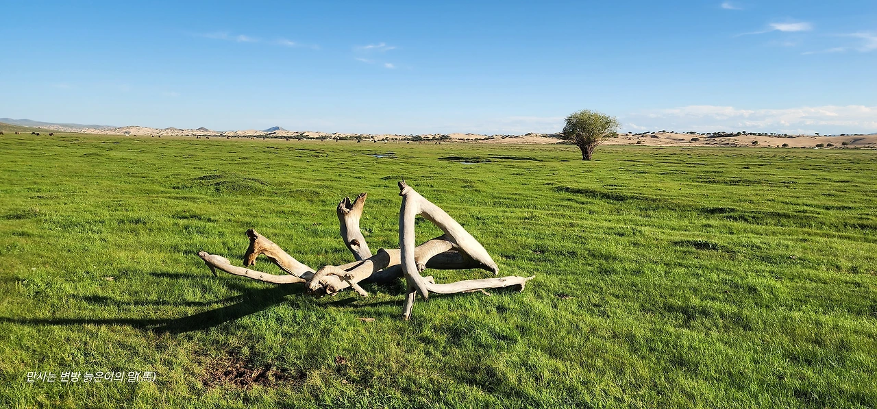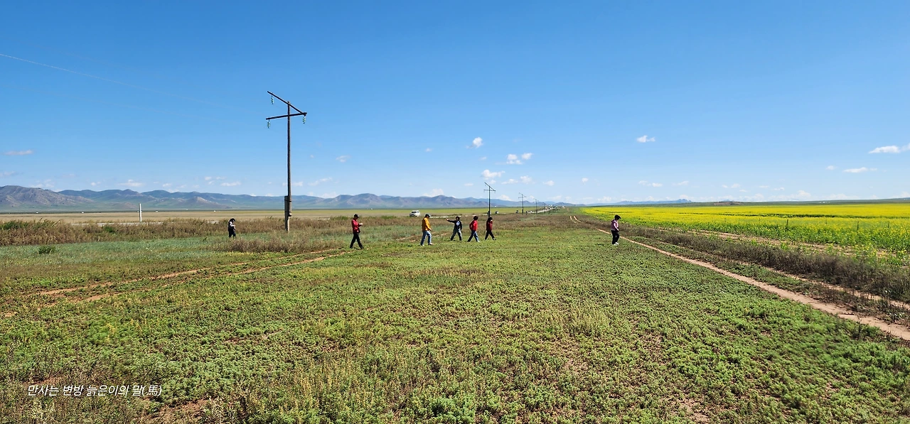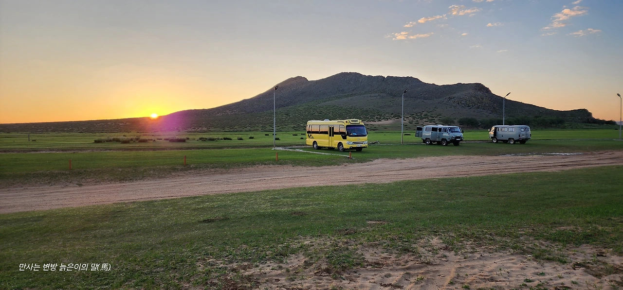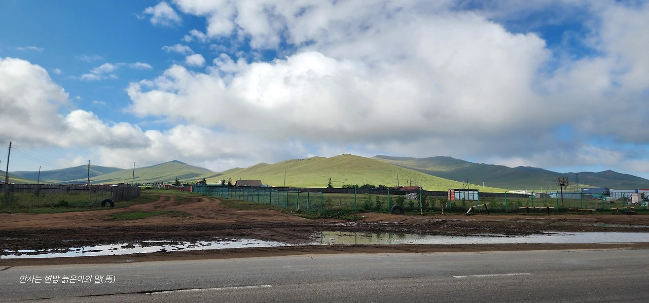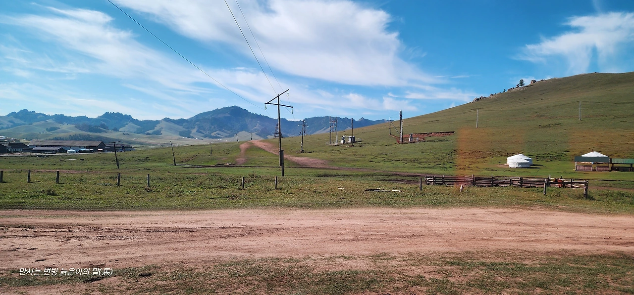 울란바토르 숙소에서 7시에 출발하여 약 300km 떨어진 [엘승타사르하] 사막으로 25인승 버스를 타고 덜컹거리는 동안 끝없는 초원이 펼쳐집니다