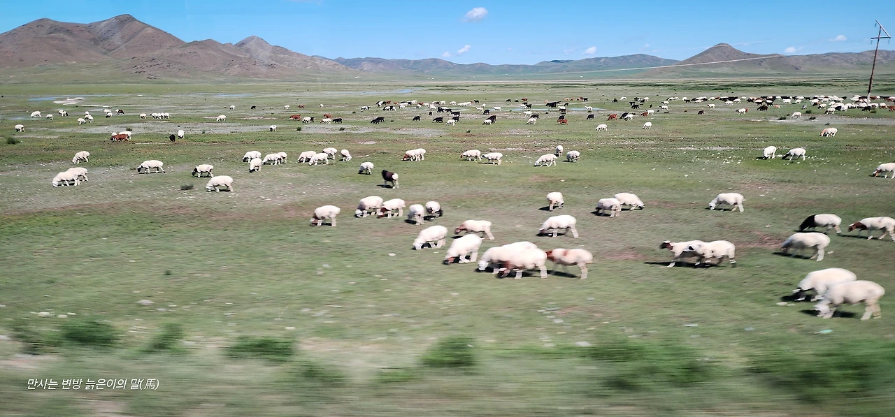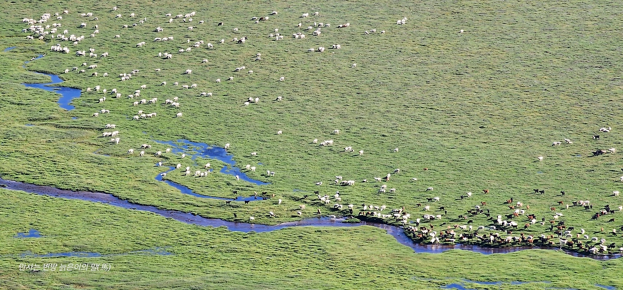 몽골몽골한 양떼들, 말떼들, 소떼들이 초록색 바탕을 수놓습니다