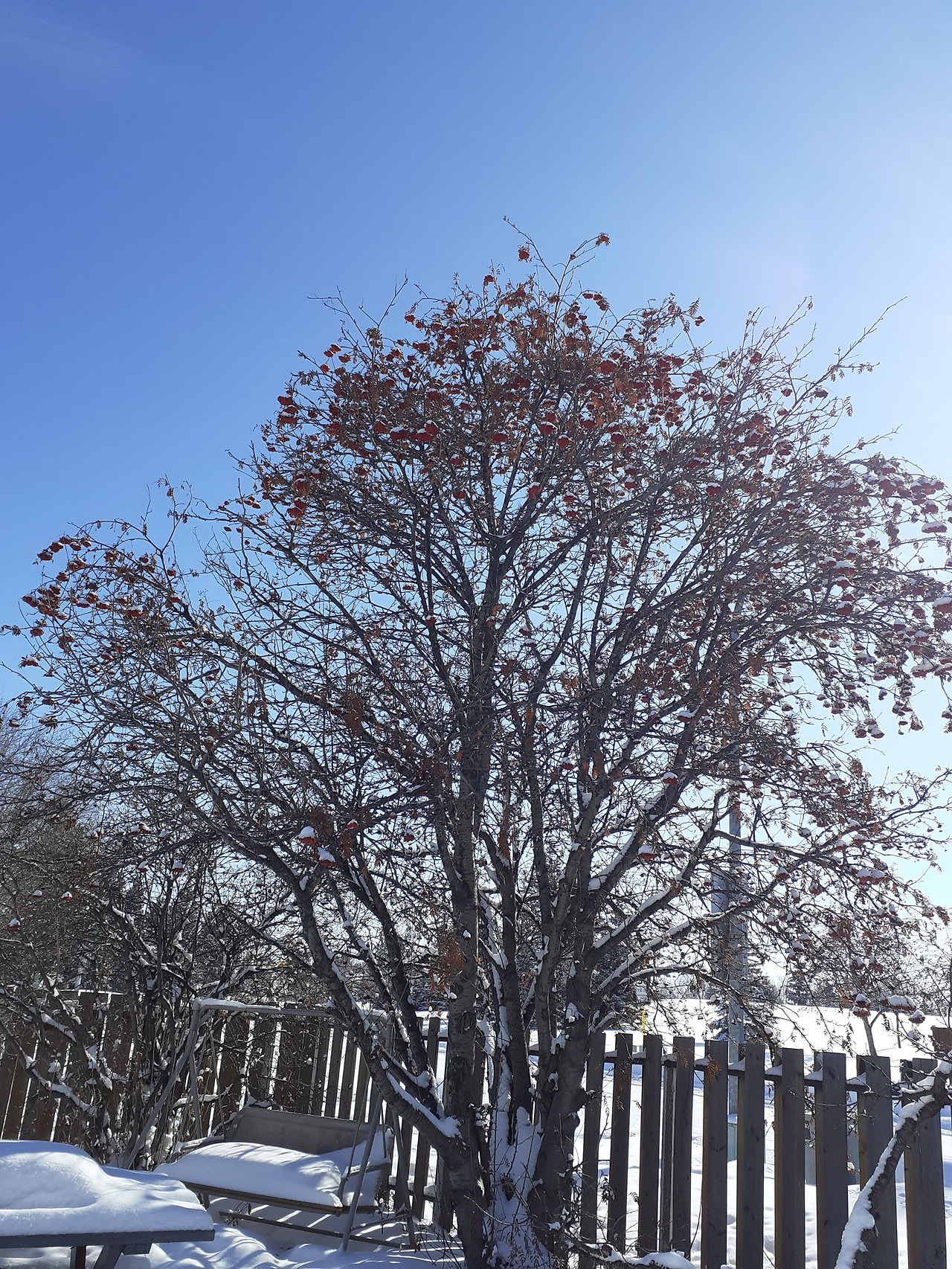 쭈글쭈글한 빨간 열매를 달고 떨고있는 마가목 나무(사진:이종숙)
