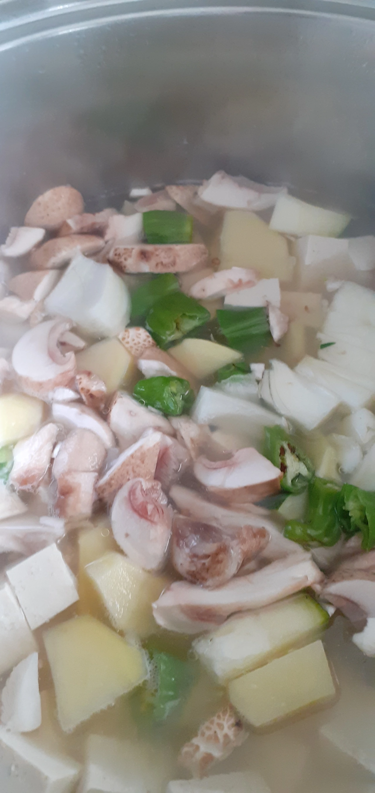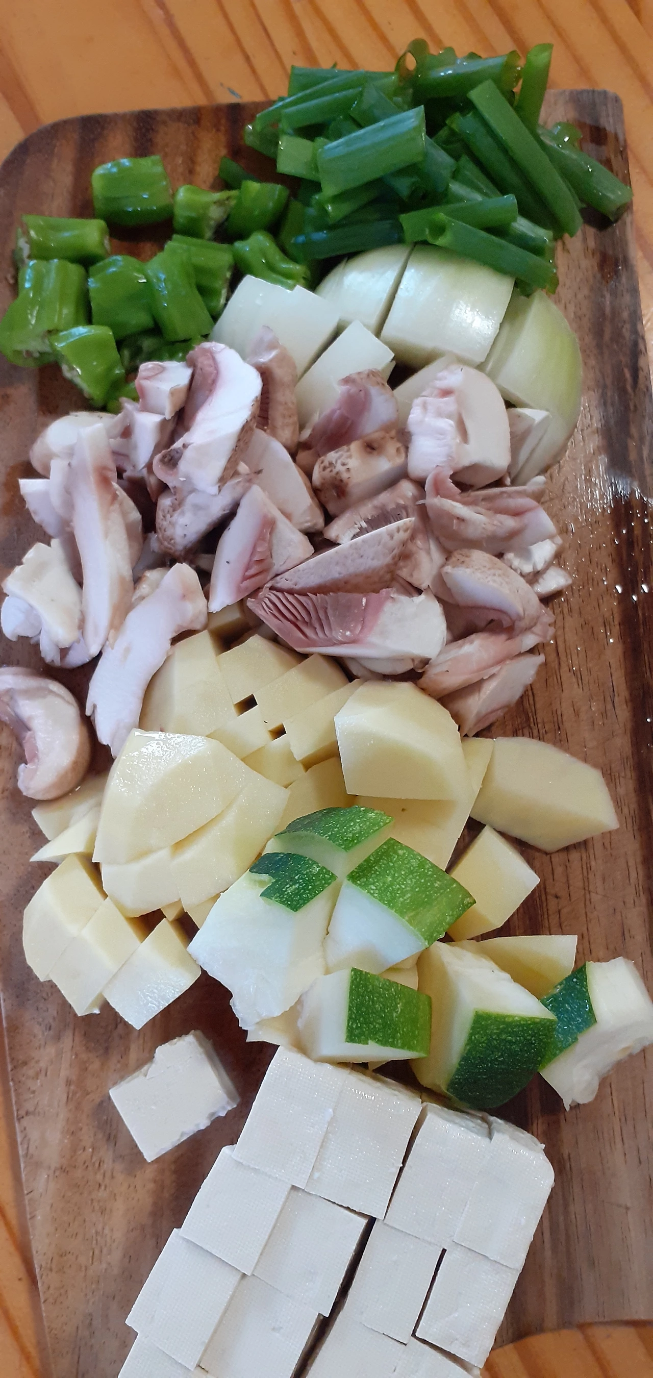 감자와 호박 양파와 버섯 그리고 두부와 파를 썰어 놓는다.