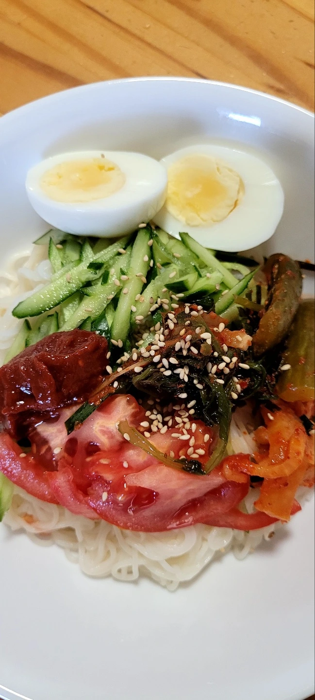 더운 날씨에 시원하게 먹을 생각에 손이 바쁘다. 오이와 토마토를 썰어놓고 삶은 국수를 찬물에 깨끗이 헹구어 물을 빼고 그릇에 놓는다. 국수 위에 썰어놓은 오이와 토마토 그리고 알맞게 익은 갓김치와 오이김치와 무생채를 넣는다. 삶은 계란을 고명으로 올려놓고 고추장 한 숟갈 간장 한 숟갈 참기름 한 방울과 깨소금을 뿌리면 멋진 비빔국수가 완성된다. 쉽고도 맛있는 비빔국수는 영원한 고향의 맛이다.