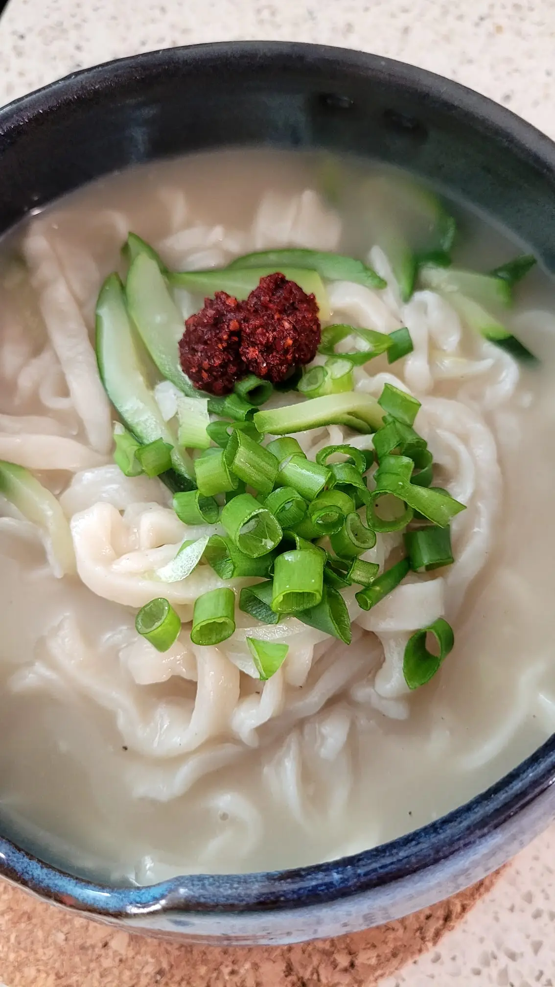 담백하게 멸치 몇 마리와 다시마 한쪽을 넣어 육수를 만들어 국수를 넣고 호박과 양파를 고명으로 넣는다. 다진 양념은고춧가루와 생강 그리고 참기름을 넣어서 섞어 먹으면 된다. 빅토리아에 오기 며칠 전, 딸이 "엄마 칼국수가 너무 먹고 싶어" 하며 문자를 보냈는데 얼마나 먹고 싶으면 문자까지 보낼까 하는 마음에 당장에라도 달려와해주고 싶었다. 오자 마자 칼국수를 해주었더니 땀을 뻘뻘 흘리며 먹는 걸 보니 기분이 정말 좋다.