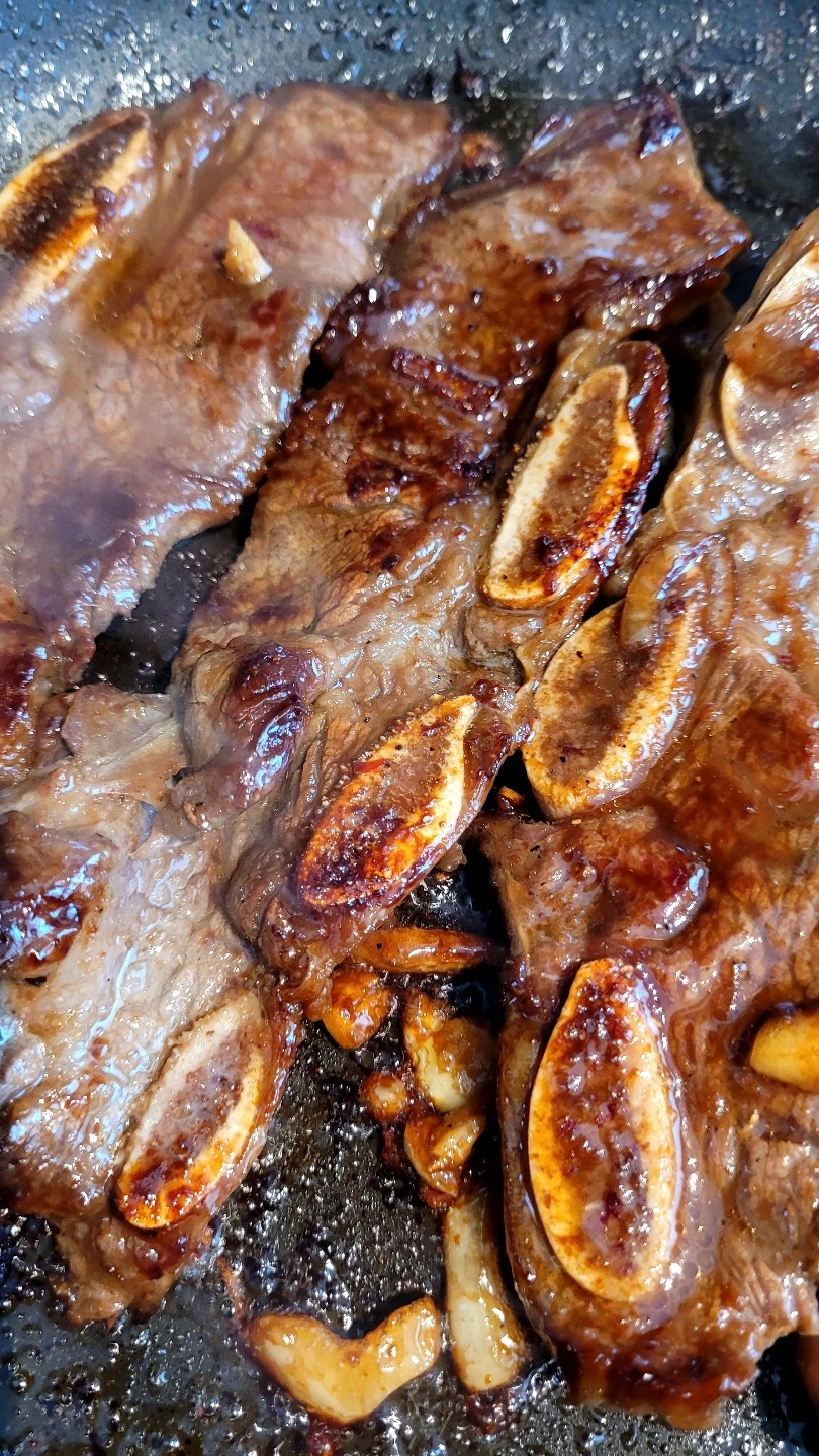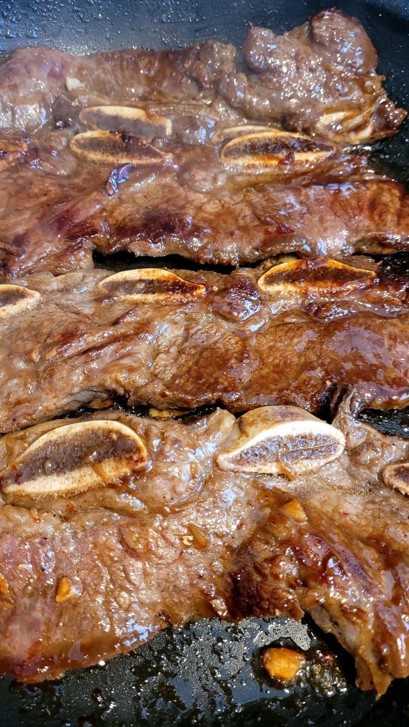 뜨거워진 프라이팬에 갈비 4개를 올리니 지지직 한다.